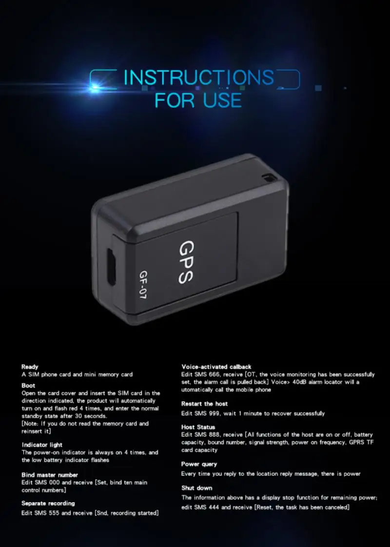 Использование: независимо от того, находится ли локатор сигнализации в машине, детских школьных сумках, карманах для пожилых людей или сумке для ценностей, вы можете отправить sms-инструкции на локатор сигнализации на мобильный телефон, чтобы узнать о местоположении локатора сигнализации, Что удобно для вас, чтобы контролировать весь процесс и захватывать местоположение цели в режиме реального времени.