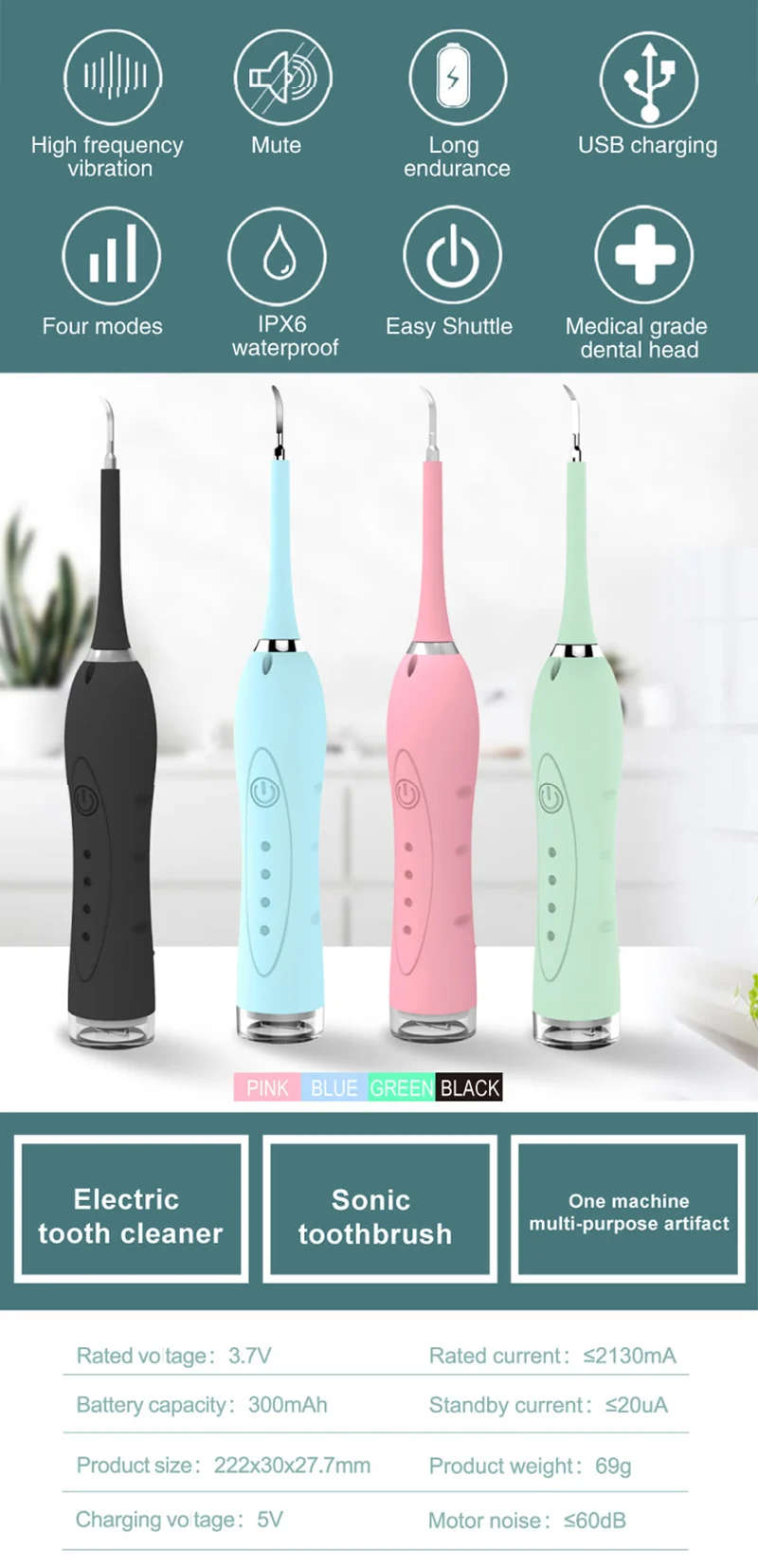 Многофункциональный набор зубных скальперов Sonic Scaler электрическая зубная щетка 3 режима IPX6 Водонепроницаемый уход за полостью рта специалист Стоматологическое вычисление удаление пятен USB зарядкаХарактеристики:Материал: АБС + силиконЦвет: черный, зеленыйВес: 0,166 кгРазмер упаковки: 24,5*9,5*3,5 смНоминальное напряжение: 3,7 VНоминальный ток: 200 мА/Адаптер питания: 5V1VВодонепроницаемость: IPX6