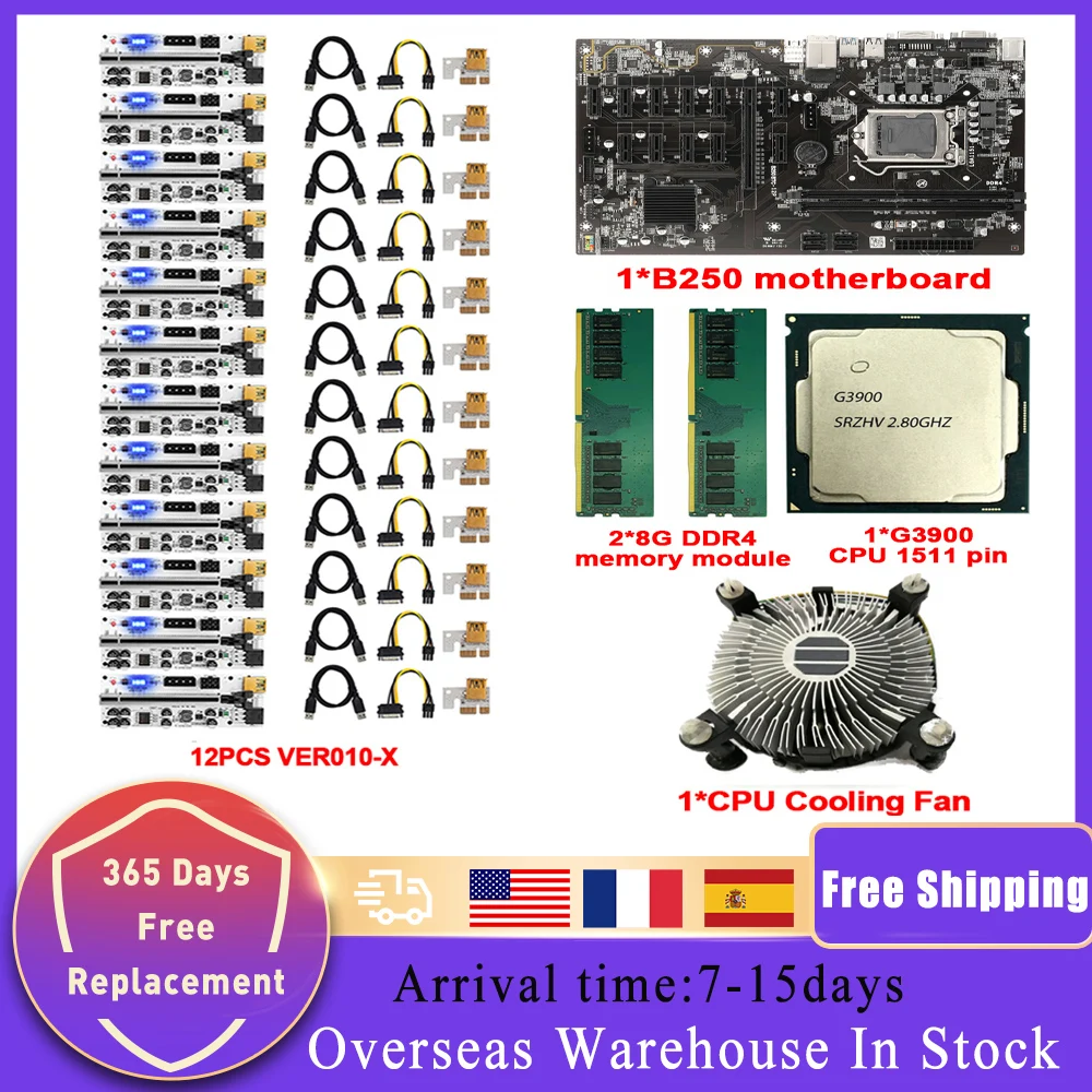 Комплект материнской платы B250 для майнинга с DDR4 VER009C010-X 1x 8x 16x PCIE RISER G3900, вентилятор охлаждения процессора для 8 12 GPU BTC ETH Miner Rig