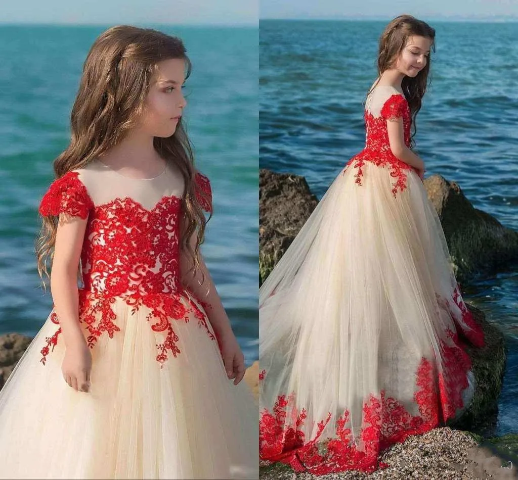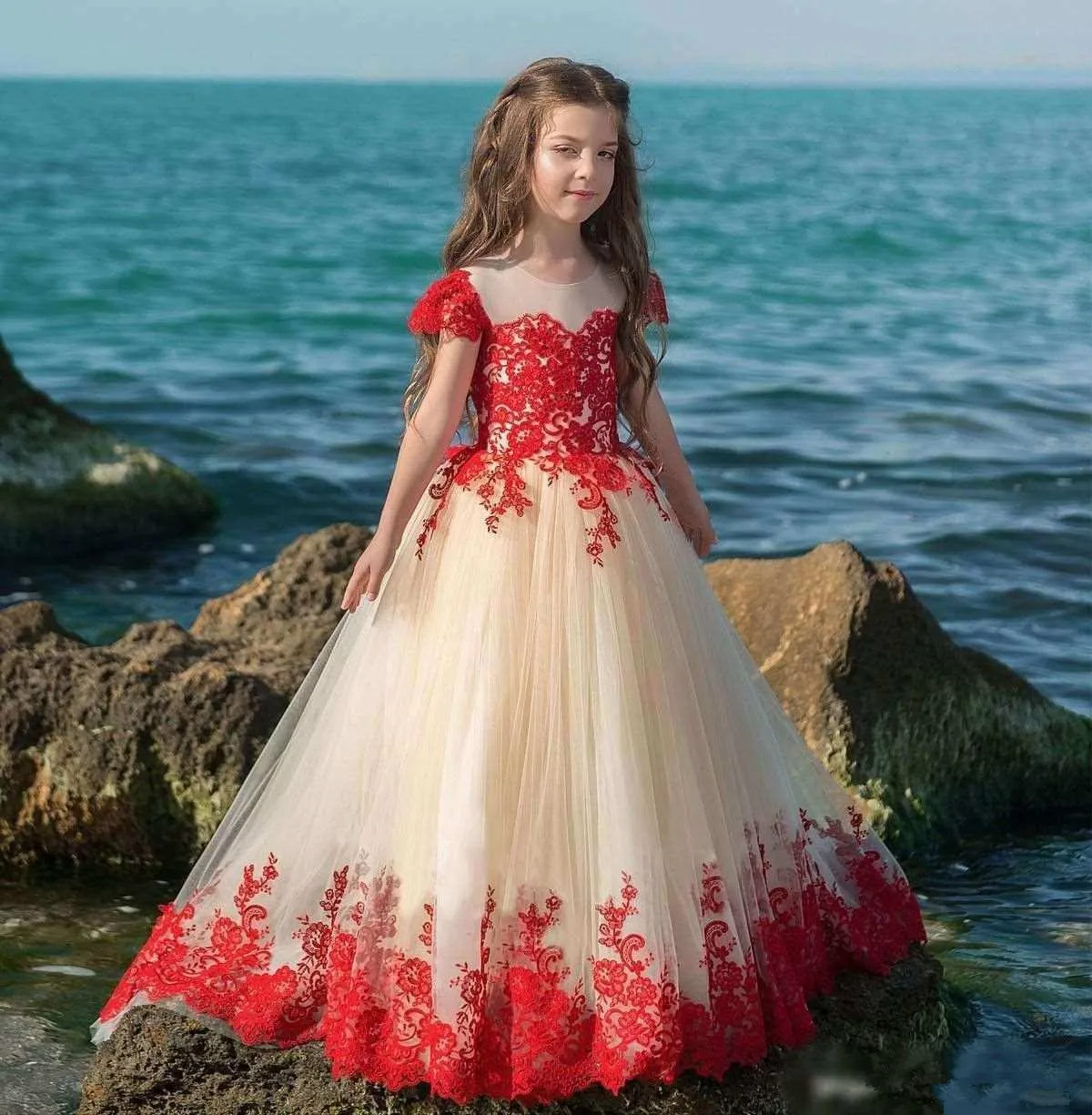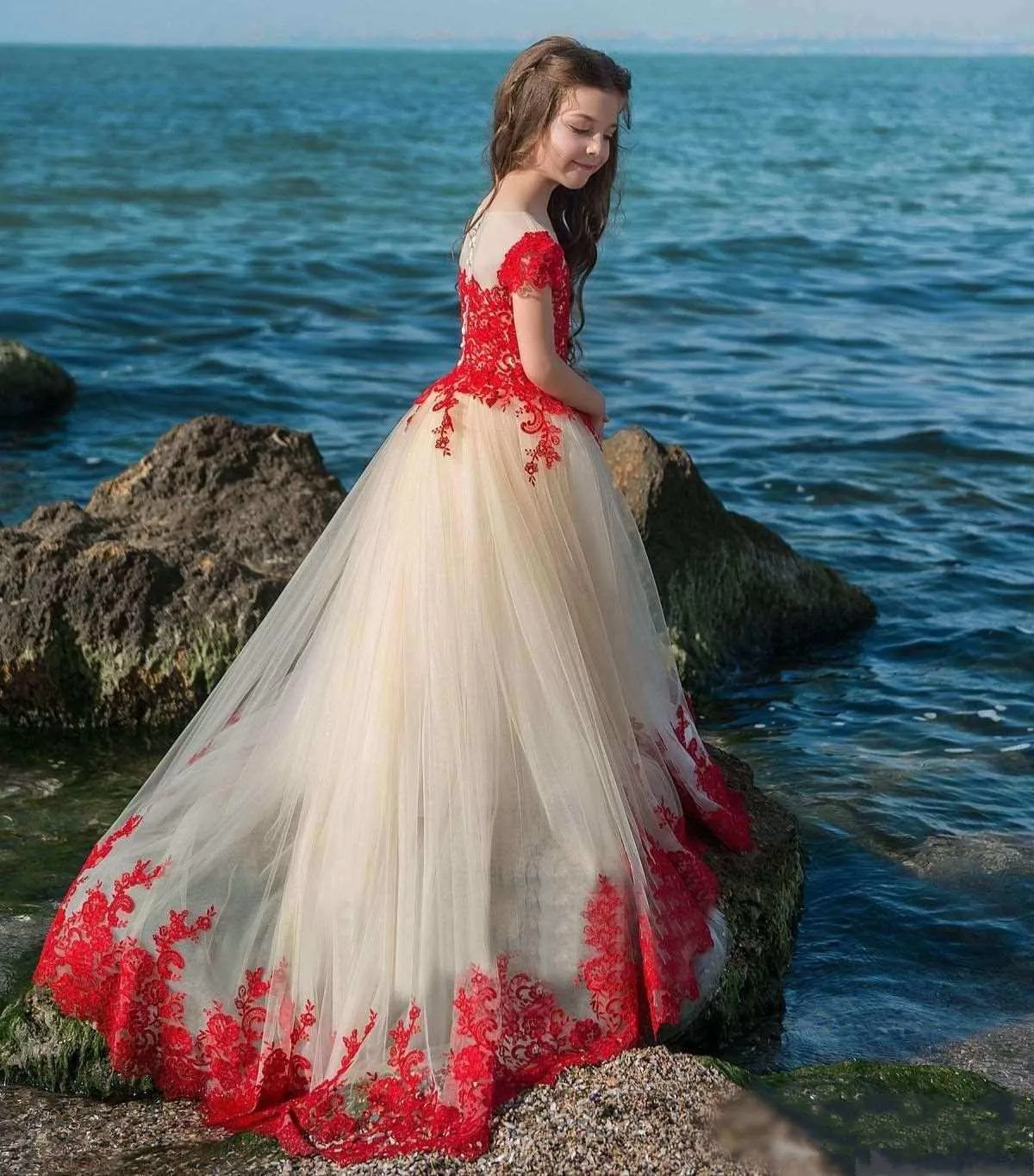 Цветочные платья для девочек, Кружевная аппликация, однослойный воротник для свадеб, тюлевые платья принцессы с коротким рукавом для первого причастия, вечеринки