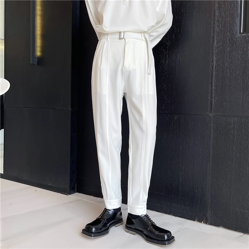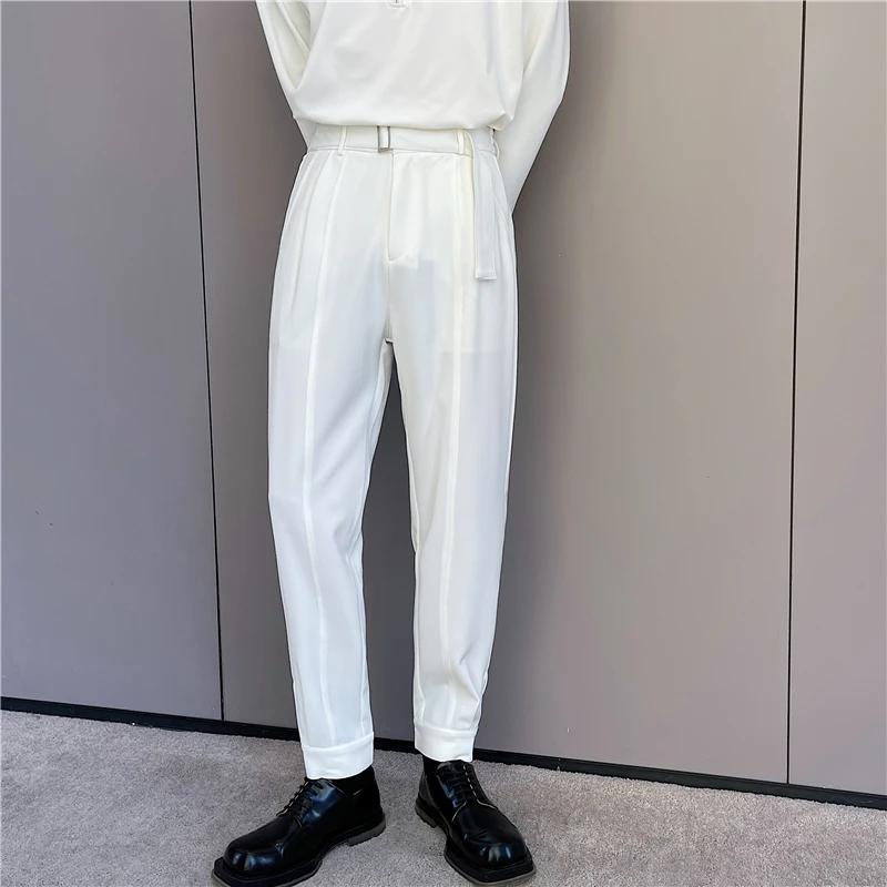 Брюки-султанки мужские корейские, однотонные повседневные суженные штаны до щиколотки, с поясом, черные белые, весна-лето