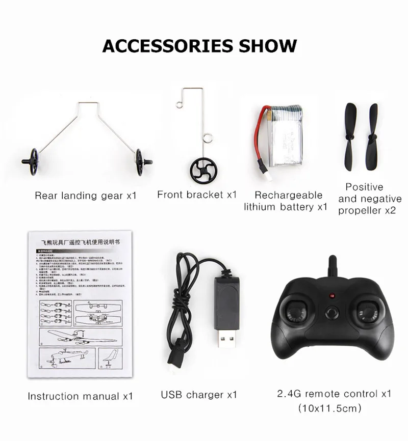 1 x RC самолет1x3,7 V 300mAh литий-полимерный Батарея (встроенный)1 х пульт дистанционного управления1 зарядное устройство USB1 х руководство на английском языке(Не содержит клея)