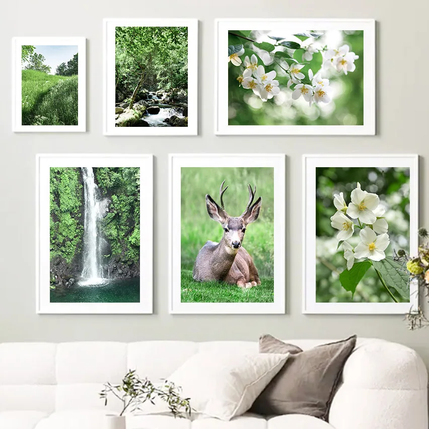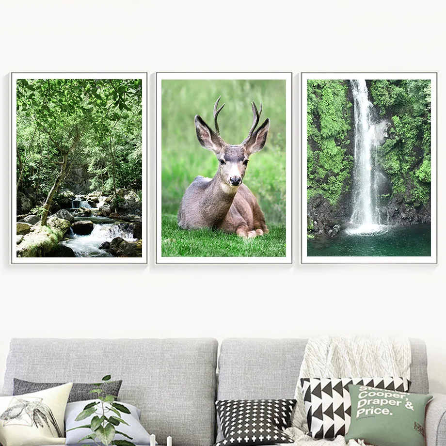 Настенная картина зеленый лес, олень, трава, водопад, цветок, настенные картины на холсте, скандинавские плакаты и принты, настенные картины для декора гостиной