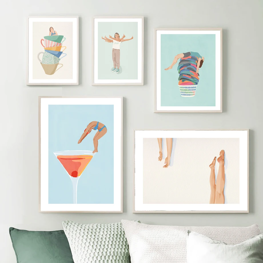 Скандинавский постер для бассейна, вечерние, плавания, ванны, кофе, девушки, абстрактная Настенная картина, холст, живопись, Декор, картины для гостиной