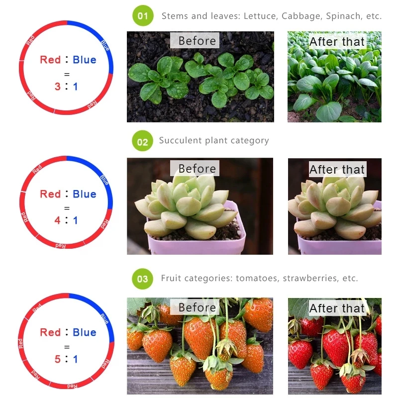 1. Синий светильник до и после длины волны 450нм может обозначить прорастание растения.2. Красный светильник длиной волны около 660нм способствует фотосинтезу, прорастанию, цветению и плодоношению растения.