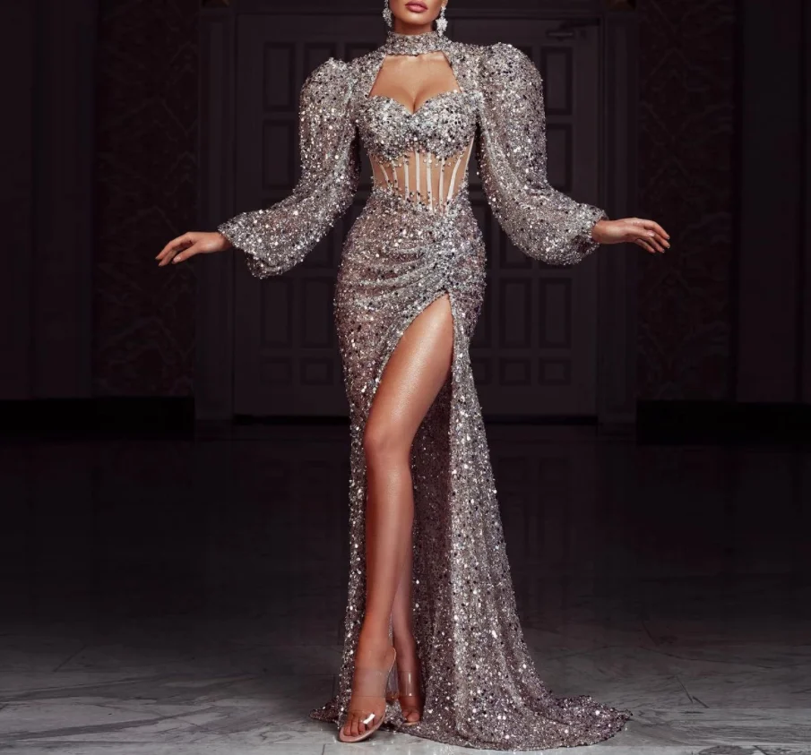 Роскошное блестящее платье для выпускного вечера с блестками 2022, сексуальные пышные вечерние платья с высоким разрезом и длинным рукавом, блестящие женские платья