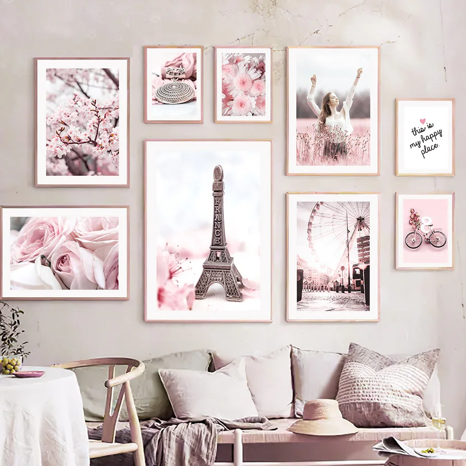 Настенная картина с розовыми цветами, Постер и принт в скандинавском стиле, велосипед, башня Парижа, Картина на холсте для украшения гостиной