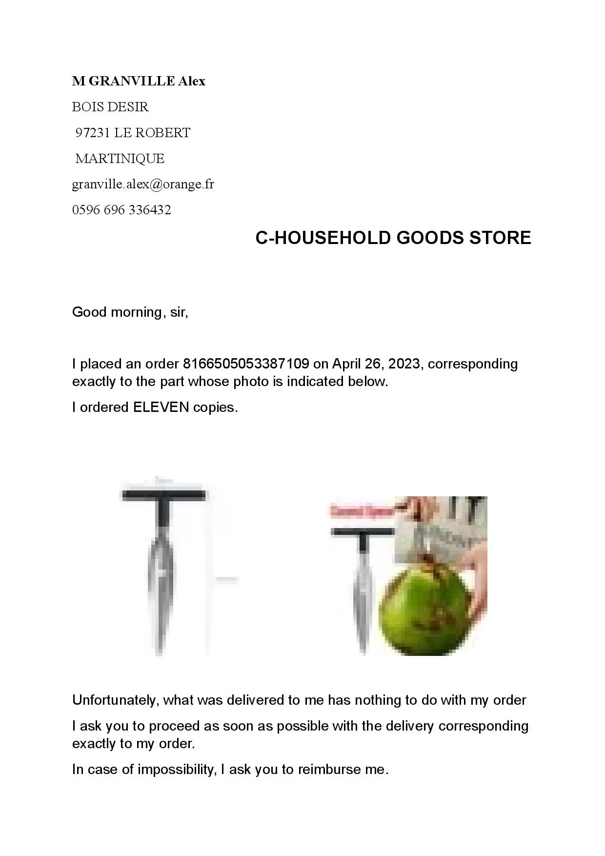 M GRANVILLE Alex BOIS DESIR 97231 ле Роберт Мартиника Granville.alex@orange.fr 0596 696 336432 C-HOUSEHOLD магазин товаров Доброе утро, сэр. Я разместил заказ 8166505053387109 26 апреля 2023, в точности соответствующий той части, фото которой указано ниже. Я заказал одиннадцать экземпляров. К сожалению, то, что было доставлено мне, не имеет отношения к моему заказу Прошу вас как можно скорее приступить к доставке, соответствующей именно моему заказу. В случае невозможности, я прошу вас возместить мне.