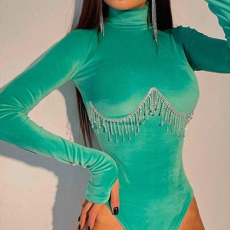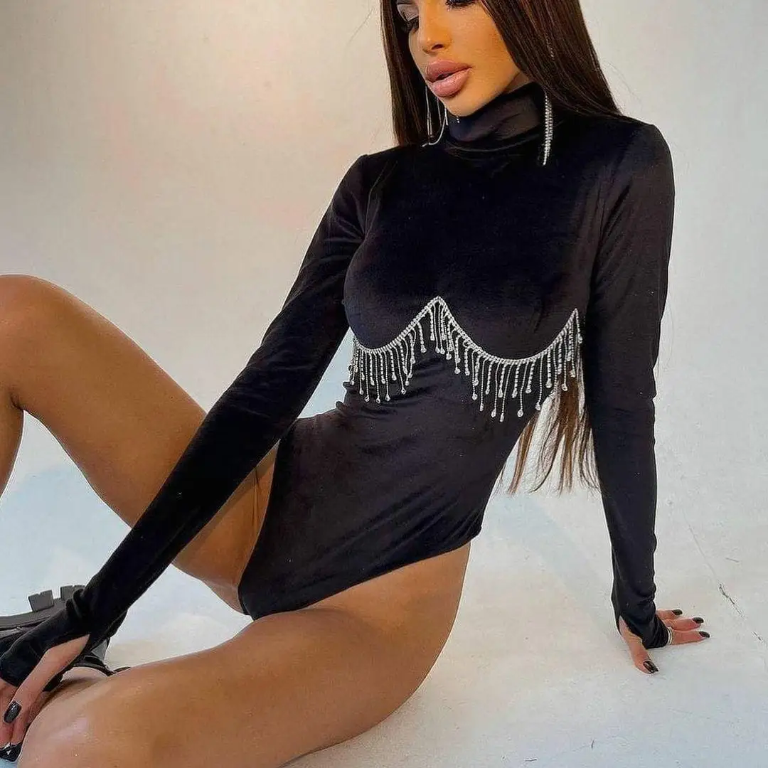 Новинка 2022, винтажные боди, женские осенние облегающие Топы с длинным рукавом и высоким воротником и бриллиантовыми кисточками, Клубные сексуальные элегантные женские боди
