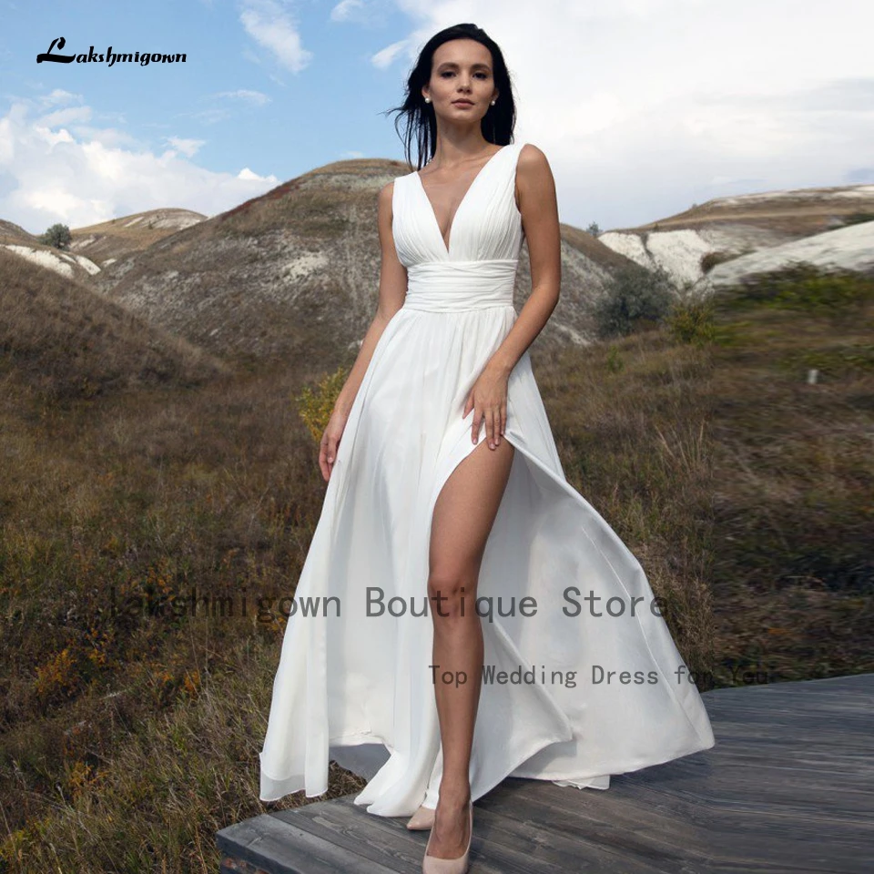 Lakshmigown свадебное платье с рюшами в стиле бохо с открытой спиной сексуальный Свадебный халат 2022 A-силуэт шифоновые пляжные свадебные платья с разрезом сбоку платья