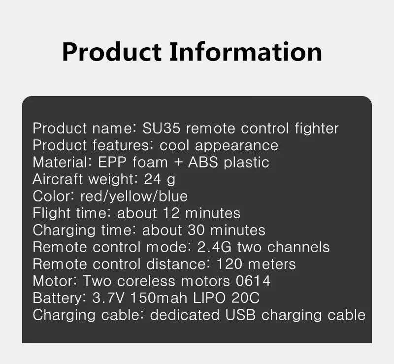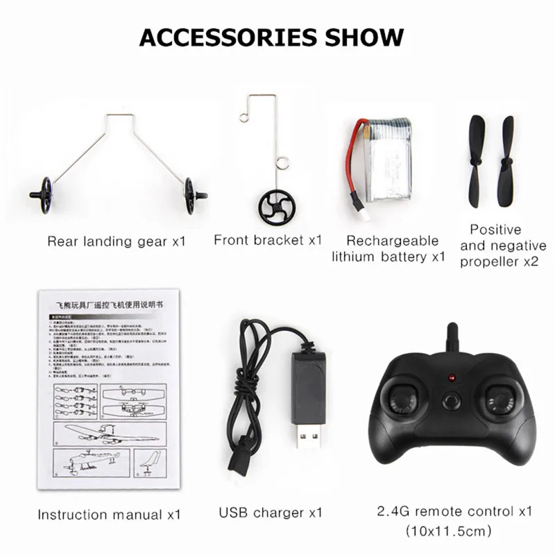 1 x RCСамолет1x3,7 V 300mAh литий-полимерный Батарея (встроенный)1 х пульт дистанционного управления1 зарядное устройство USB1 х руководство на английском языке(Не содержит клея)