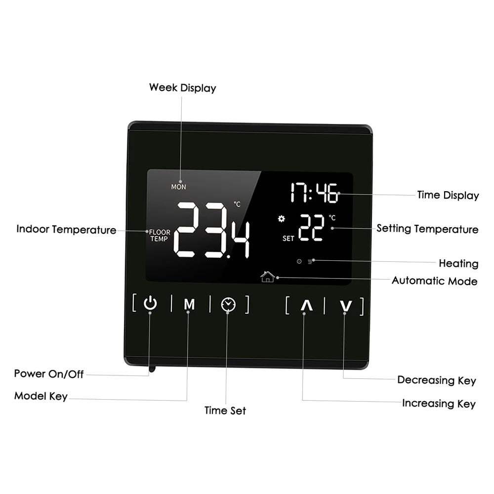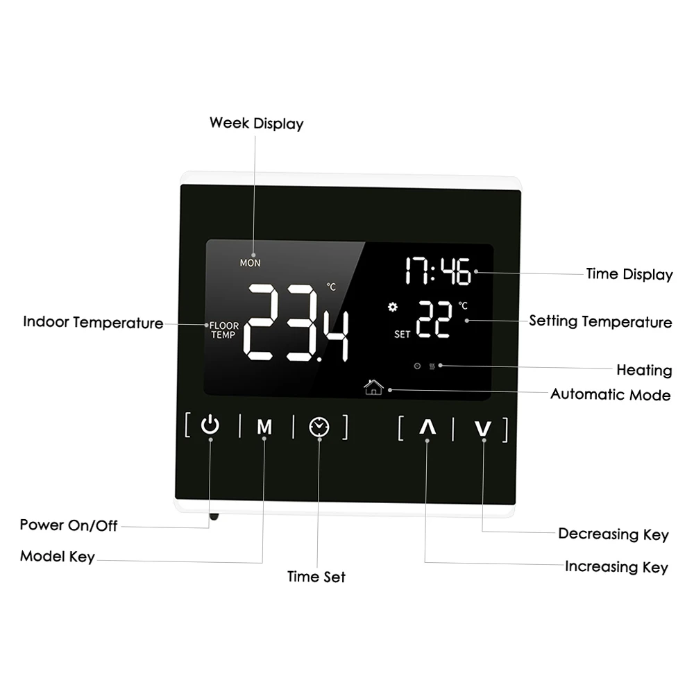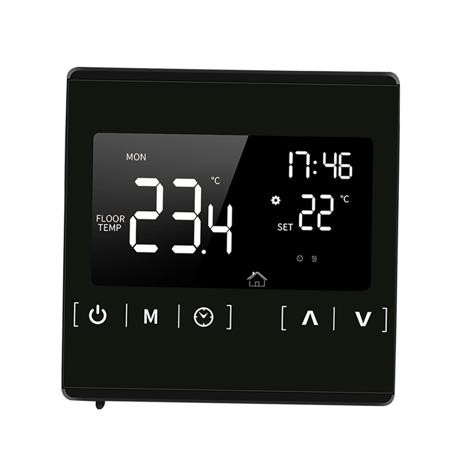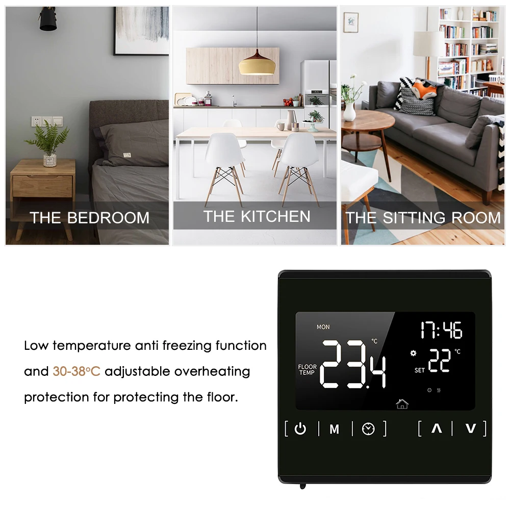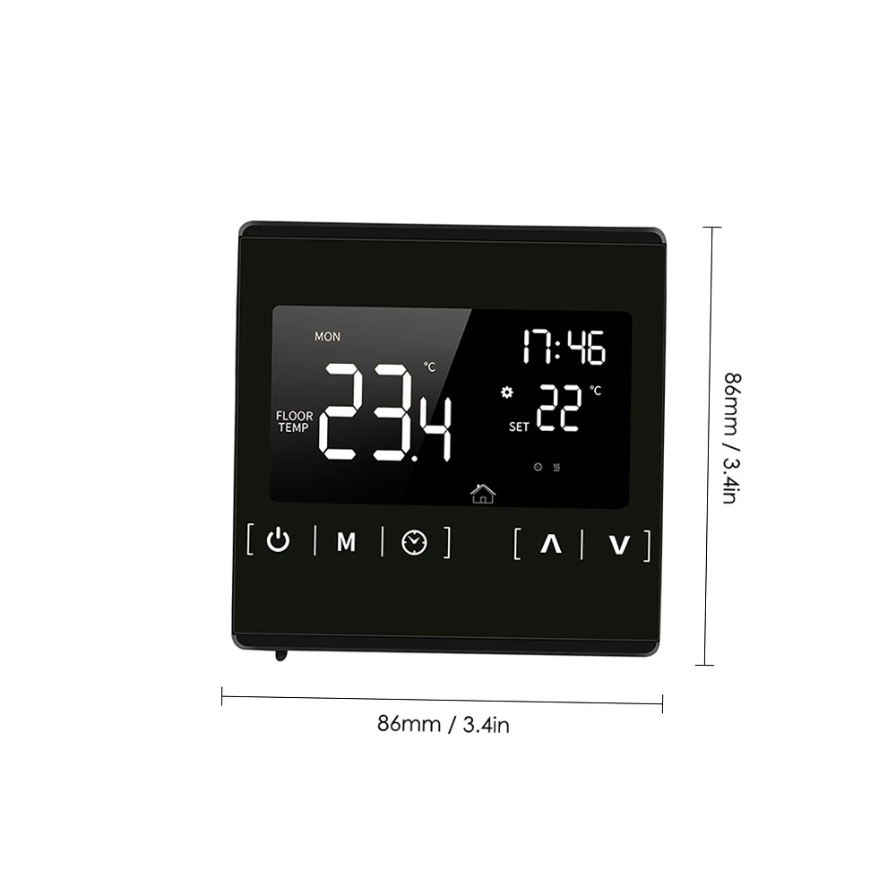 Этот цифровой термостат для напольного отопления использует передовое микрокомпьютерное управление чипом и высокоточный датчик для контроля температуры электрических нагревательных устройств. Управляйте моторизованным шаровым клапаном, моторизованным клапаном, тепловым клапаном, электромагнитным клапаном, нагревателем, электрической нагревательной пленкой и электронагревательным углеродным кристаллом. В основном используется для напольного отопления.Особенности:Термостат с подогревом сенсорного экрана, прост в установке и использовании и удобно сочетается с вашим стилем жизни.Программируйте его на основе вашего графика, чтобы сократить ваши счета за электричество. Гибкие программируемые сроки: 5-2 дня или 6-1 день.В состоянии выключения, функция анти-замерзания при низкой температуре будет автоматически включаться, когда он будет ниже 5 ℃; И защита от перегрева начнется, когда он будет более 7 ℃ для защиты пола.Ручной режим и программируемый режим можно выбрать с 3 метровым внешним датчиком.6 режимов программируемой функции для контроля температуры и времени. Доступны часы и минуты.Функция блокировки клавиатуры для предотвращения неправильного использования детьми.Функция памяти при отключении питания Защитите настройки от сбоя питания.Характеристики:Цвет: черный/белый (по желанию)Материал: Огнестойкий поликарбонат + АБС-пластикВходная частота: 60 ГцВходное напряжение: 85-250 В переменного токаДатчик температуры: термометр NTCТочность контроля температуры: ± 1 ℃Потребляемая мощность: <1 ВтТок нагрузки: 16AКлюч: сенсорное управлениеНастройка температуры: от 5 до 50 ℃Диапазон измерения температуры: -9 ℃ ~ 99 ℃Дисплей: 71*40 мм ЖК-дисплейРасстояние между установленными отверстиями: 60 ммПодходящий Размер коробки: 86*86 ммРазмер изделия: прибл. 86*86*45 мм/3,4*3,4 * 1.77inВес изделия: прибл. 135g/4,8 ozРазмер посылка: прибл. 10,4*10*8 см/4,1*3,9 * 3.1inВес посылка: прибл. 277 г/9,8 унцийУпаковочный лист:1 * термостат для подогрева пола1*3 метра кабель внешнего датчика2 * крепежные винты1 * Руководство пользователя (на английском и русском языках)Примечание:Для установки термостата необходимо подготовить распределительную коробку на стене, подходящий размер 86*86 мм. И расстояние установки 60 мм.