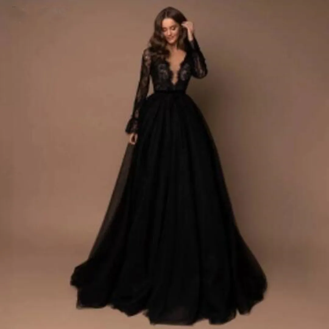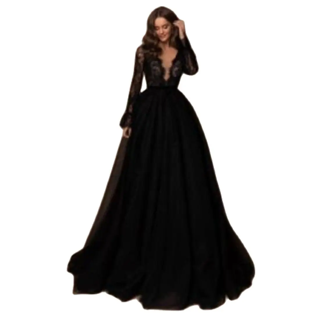 Женское вечернее платье с длинным рукавом, черное платье с глубоким V-образным вырезом, в арабском стиле, для выпускного вечера, 2019