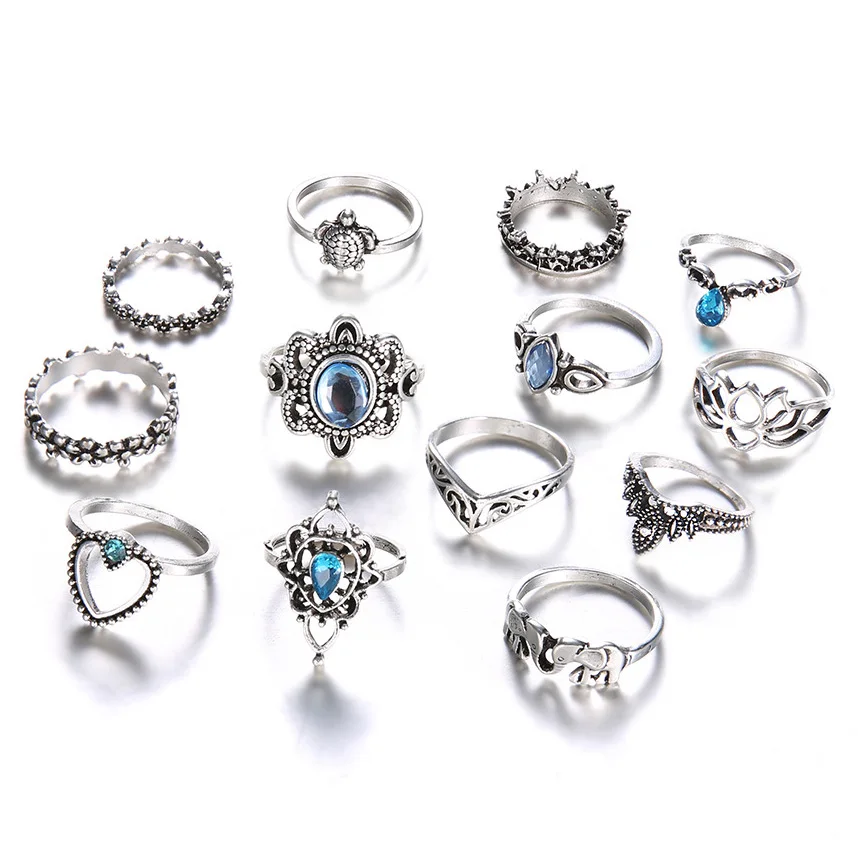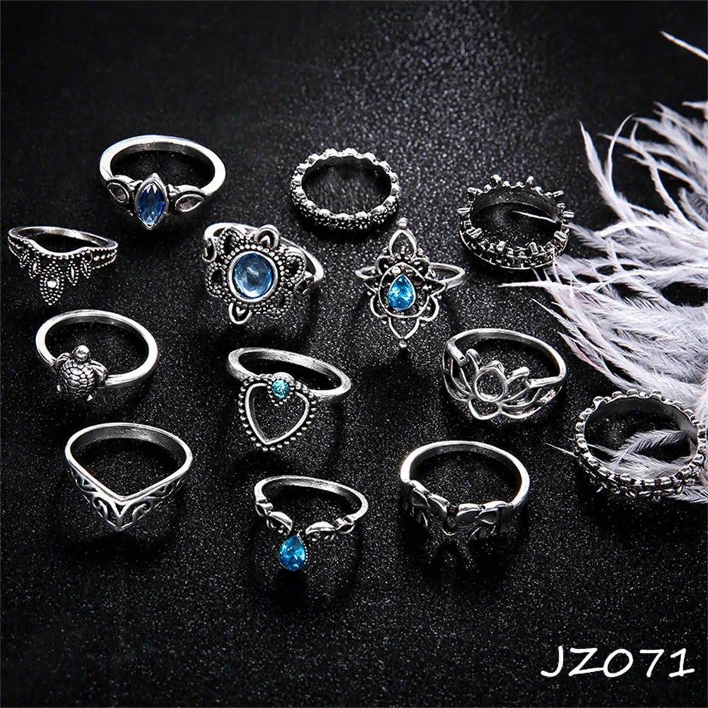 Купите 1 и получите 2 Винтажный серебряный набор многоэлементных колец 13 шт.партия, украшения в этническом стиле для женщин, драгоценный камень, черепаха, полые, личные
