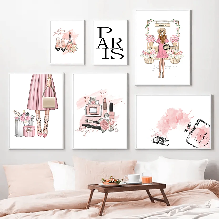 Розовый цветок парфюм девушка сумка пятка модный макияж Искусство Холст Картина скандинавский постер и искусство для гостиной Декор