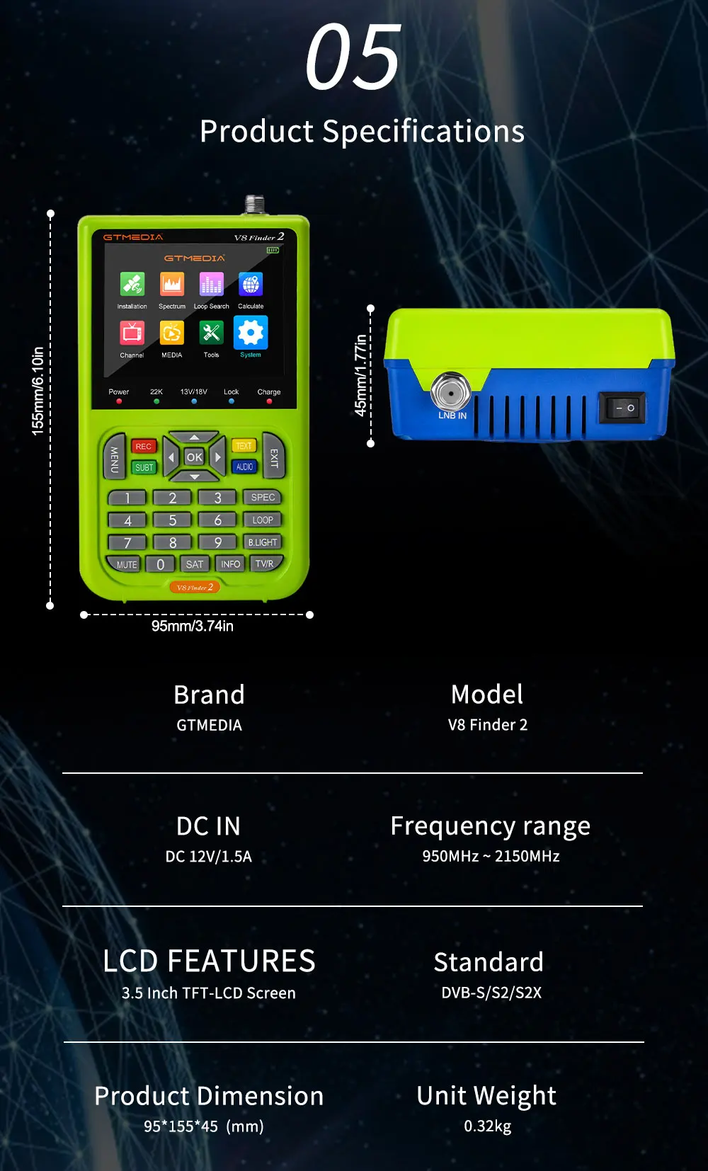 -- Цифровое измерительное устройство для повышения уровня сигнала и качества. Поддержка предварительной настройки всей спутниковой информации
