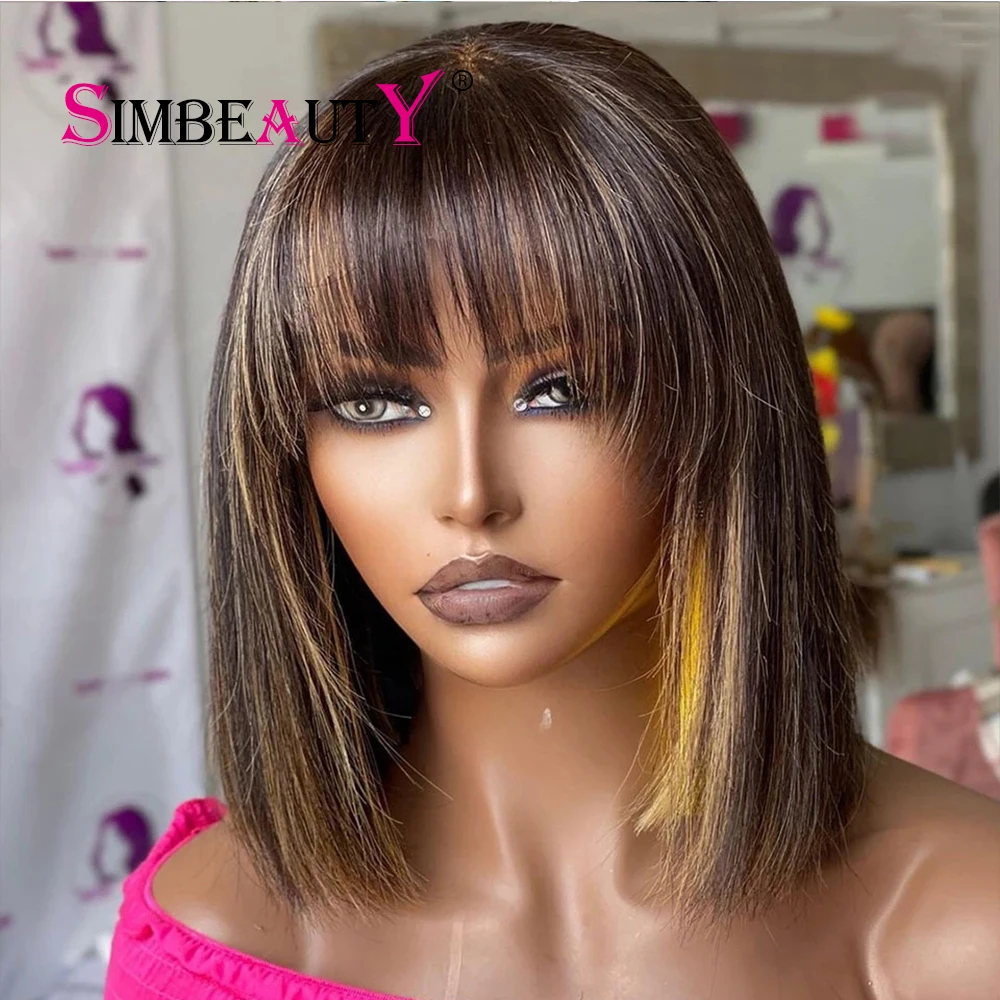 Боб с прямыми блонд, бахрома парик 13X6 HD Синтетические волосы на кружеве человеческих волос парики с челкой натуральных волос 360 прозрачного кружева