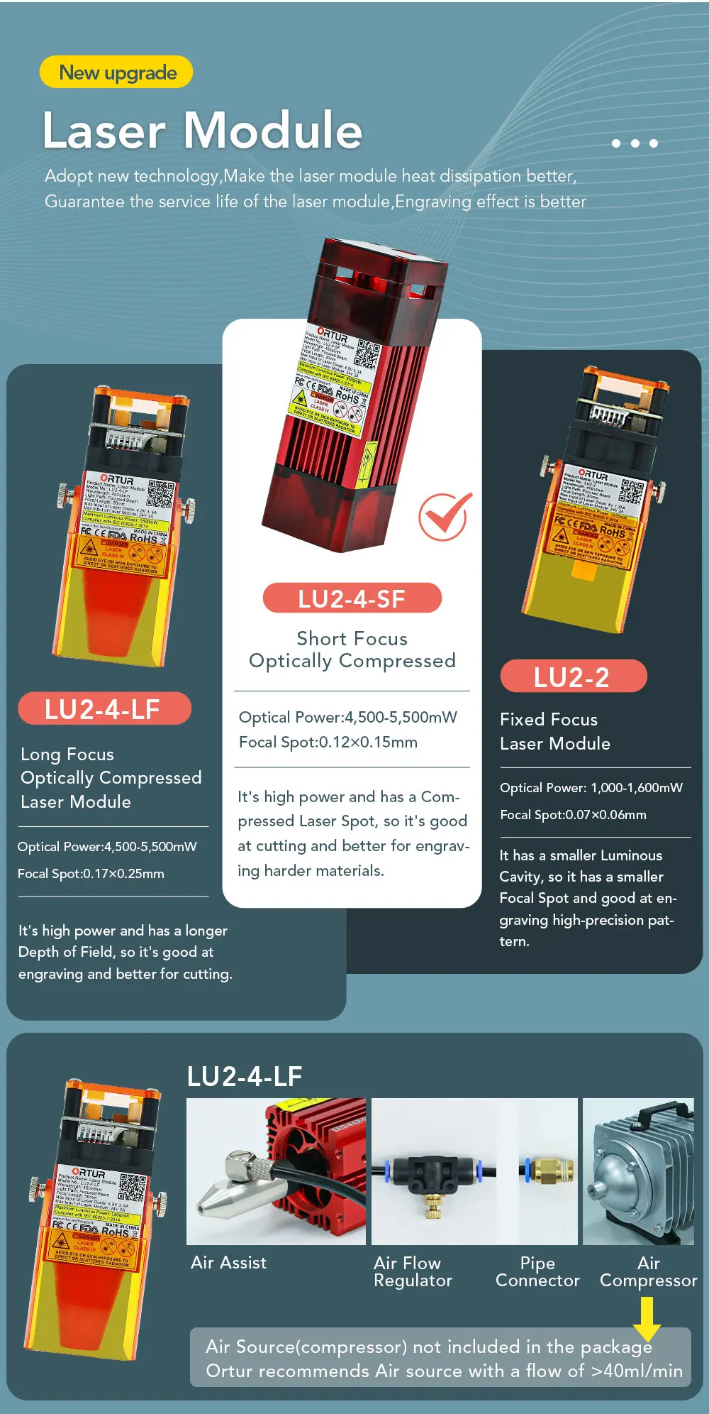 Available Laser ModulesLU2-4 24V FAC Laser Module (Electric Power: 20W, Luminous Power: 4,500-5,000mw)