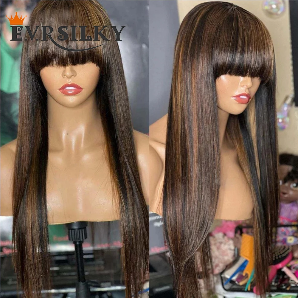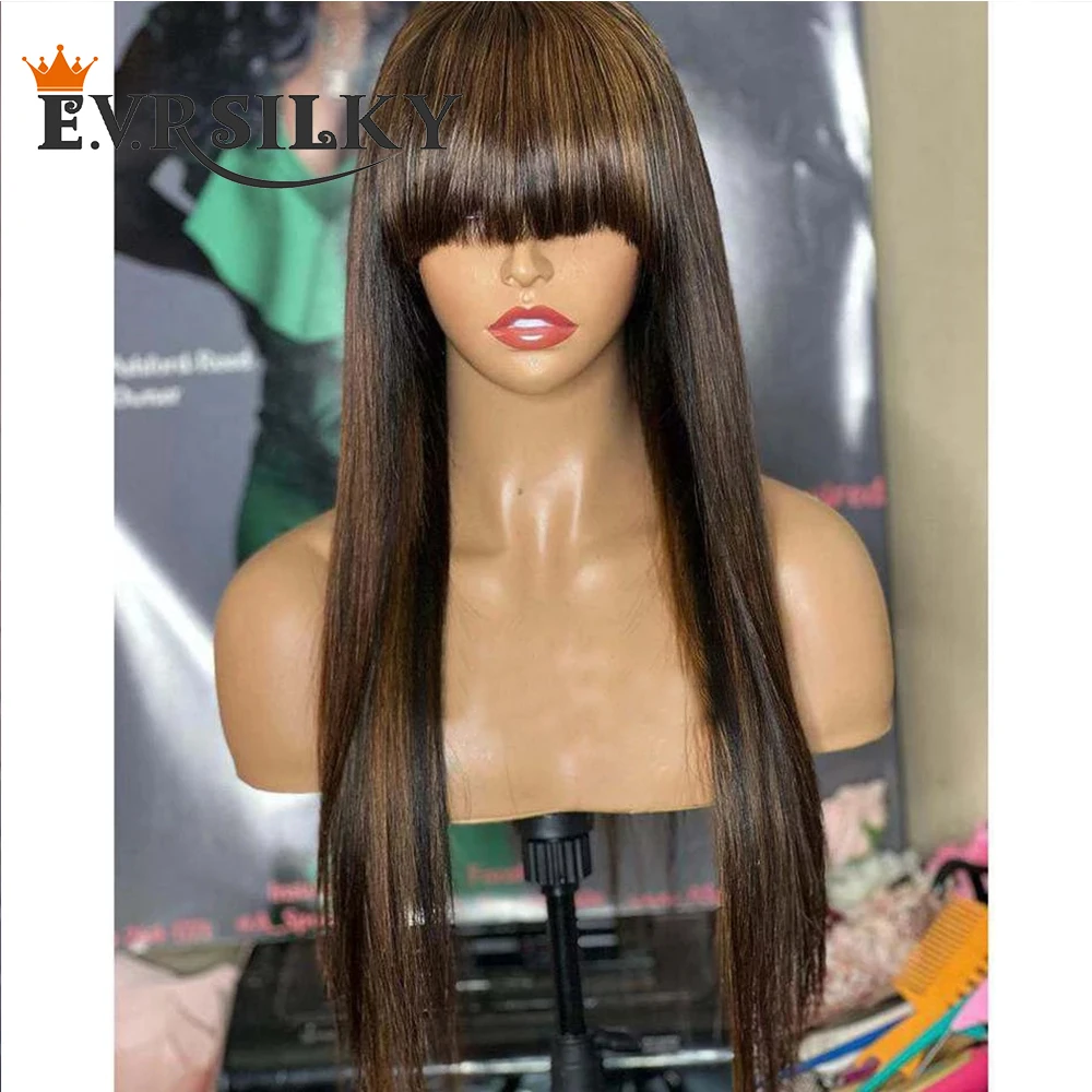 Парики с бахромой 200, блестящие темные, шоколадно-коричневые, 360 HD, фронтальные парики с челкой, искусственные волосы