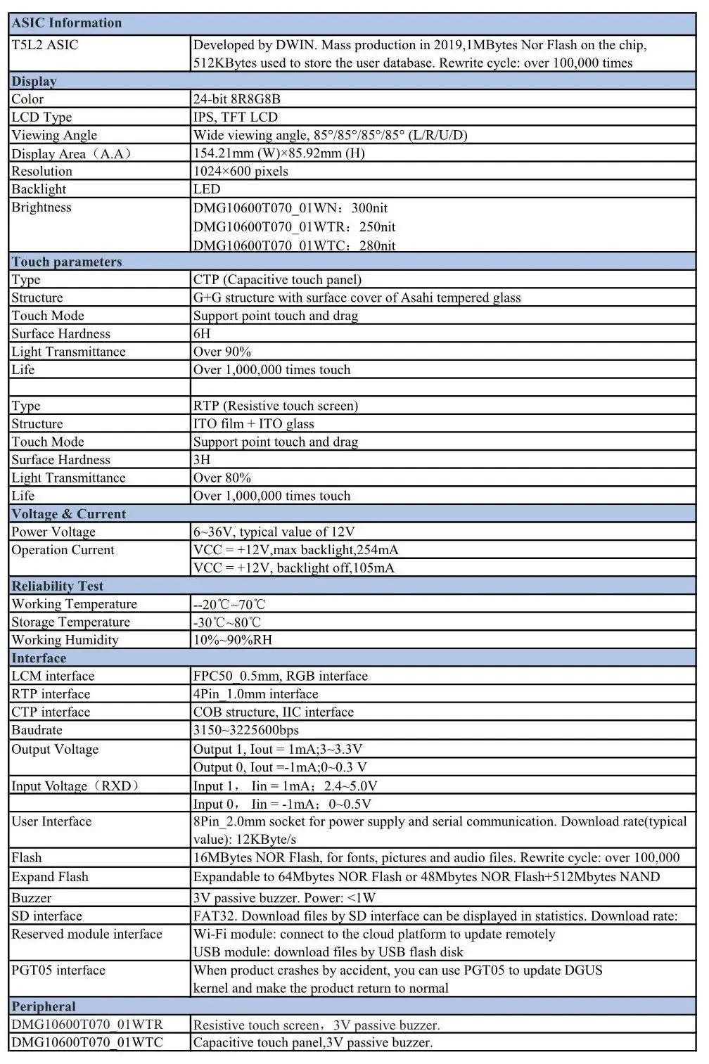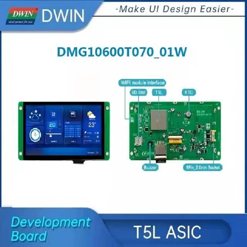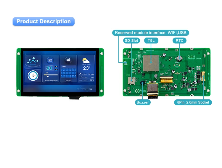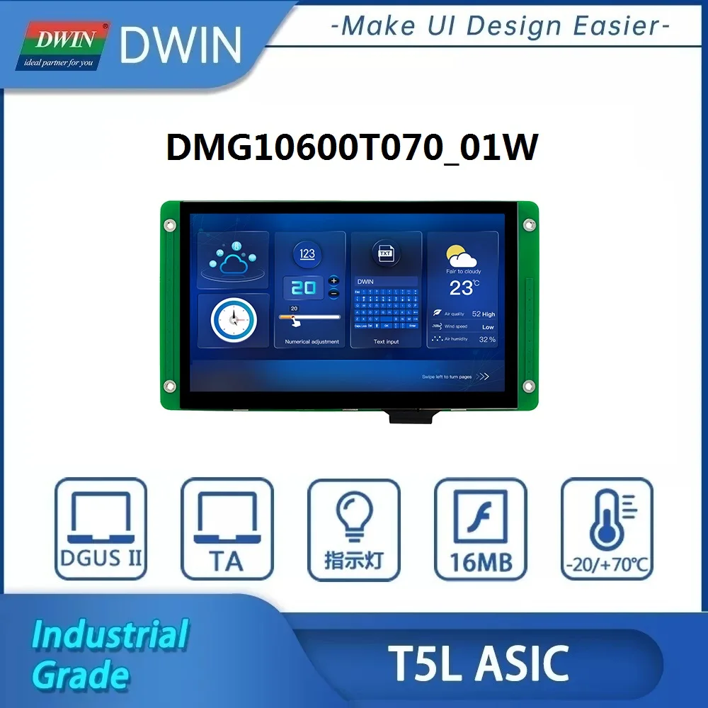 Модель DMG10600T070_01W-это интеллектуальные Емкостные/резистивные сенсорные экраны с UART портом, который может управляться любым MCU через простой мощный командный набор, поэтому его можно использовать в качестве TFT дисплея и сенсорного контроллера в различном электронном оборудовании. Панель ЖК-дисплея, сенсорный ЖК-экран, дисплей DWIN-ваш лучший выбор для проекта HMI.