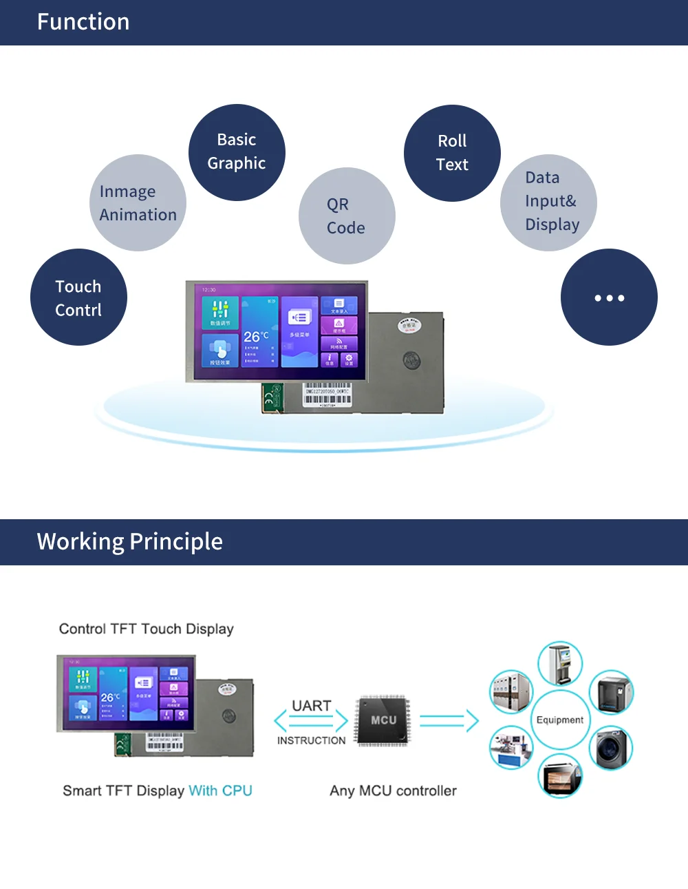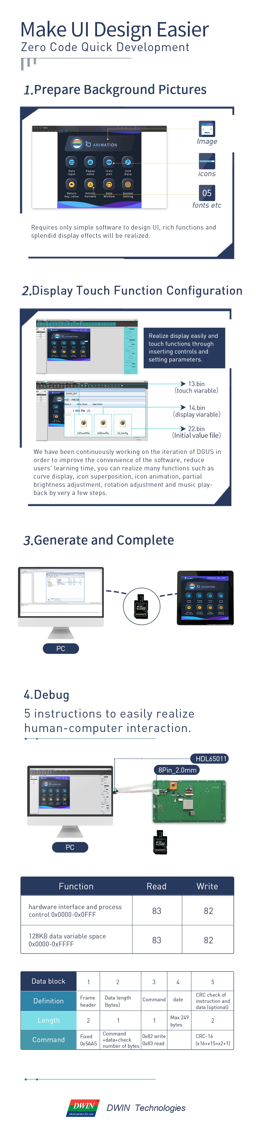 1. Вы производитель или торговая компания?Мы являемся производителем. Штаб-квартира DWIN расположена в Пекине, который имеет производственный парк площадью 250000 квадратных метров в провинции Хунань, Китай. Вся продукция поставляется на нашей фабрике Хунань.2.Включает ли ваш продукт программное обеспечение?Да. Все смарт-дисплей основан на свободном DGUS программном инструменте, но разный тип для каждого процессора (K600 +, T5,T5L). Вы можете проконсультироваться с инженером по продажам для получения подробной информации.3.Как мне программировать дисплей?Шаг 1: Подключите смарт-дисплей к ПК с аксессуаром (провод, адаптер и т. Д.).Шаг 2: создайте пользовательский интерфейс на основе программного инструмента DGUS.Шаг 3: Загрузите папку DWIN_SET на дисплей (можно считывать только папку DWIN_SET на sd-карте).Шаг 4: имитация связи между ПК и смарт-дисплеем на основе протокола DWIN и настройки адреса.Убедитесь, что у вас есть руководство, Заводская демонстрация, программное обеспечение и другие, которые полезны для вашего развития.4.Какой интерфейс у смарт-дисплея?Дисплей основан на связи последовательного порта UART. TTL/RS232/RS485 доступен.5.Я хочу сделать некоторые настройки на вашем смарт-дисплее. Это возможно?Да, возможно изготовление на заказ. Дизайн может включать1) Настройка TFT-LCD модуля в соответствии с требованиями заказчика;2) Разработка функции настройки;3) расширение флэш-памяти до 1 Гб или 2 Гб;4) назначьте интерфейс RS232, RS485 или TTL.6.Вы используете резистивный сенсорный или емкостный сенсорный дисплей?Не сенсорная панель, резистивная сенсорная панель, емкостная сенсорная панель все доступны.7.Как я могу получить техническую поддержку, если возникнут какие-либо проблемы в период разработки?Всегда оставайтесь на связи с инженером по продажам. Если нет такого канала, вы можете отправить электронное письмо на адрес dwinhmi@dwin.com.cn, чтобы получить помощь вовремя.8.Как Вы гарантируете качество?Фабрика находится под управлением качества ISO9001. И продукт может пройти CE, Rohs сертификат. Мы предоставляем 12-месячную гарантию для неискусственное дефект.9.Есть ли у вас лимит минимального заказа?Нет ограничений на минимальный заказ. 1 образец также приветствуется. Если вы по-новому пользователя, заинтересованы в нашей смарт-дисплей, 2,8 дюйма, 3,5 дюйма, 4,3 дюйма может быть хорошим выбором, который дешевле, при наличии необходимой функции.10.Я хочу выбрать умный дисплей, используемый в медицинском оборудовании. Есть ли у вас такой тип?Да, у нас есть. Наш смарт-дисплей может быть разделен на несколько типов, включая коммерческий класс, промышленный класс, медицинский класс, автомобильный класс, военный класс, чтобы удовлетворить требования к качеству в различных отраслях промышленности.11.Может ли ваш умный дисплей подключаться к ПЛК?Да. Смарт-дисплей содержит протокол DWIN, также поддерживает протокол Modbus. Может быть подключен к ПЛК, любому MCU и т. Д.12.Кроме смарт-дисплея, что еще у вас есть?DWIN постоянно проводит исследования и продвигает новый продукт каждый год. С одной стороны, обновите дизайн Смарт-дисплея. С другой стороны, продвижение других продуктов, включая Android LCD дисплей, HDMI HD дисплей, термостат и т. Д. Вы можете проверить с инженером по продажам для получения дополнительной информации.13.Какие условия оплаты вы поддерживаете?T/T банком, Paypal и т. Д.14.Могу ли я провести экскурсию по фа