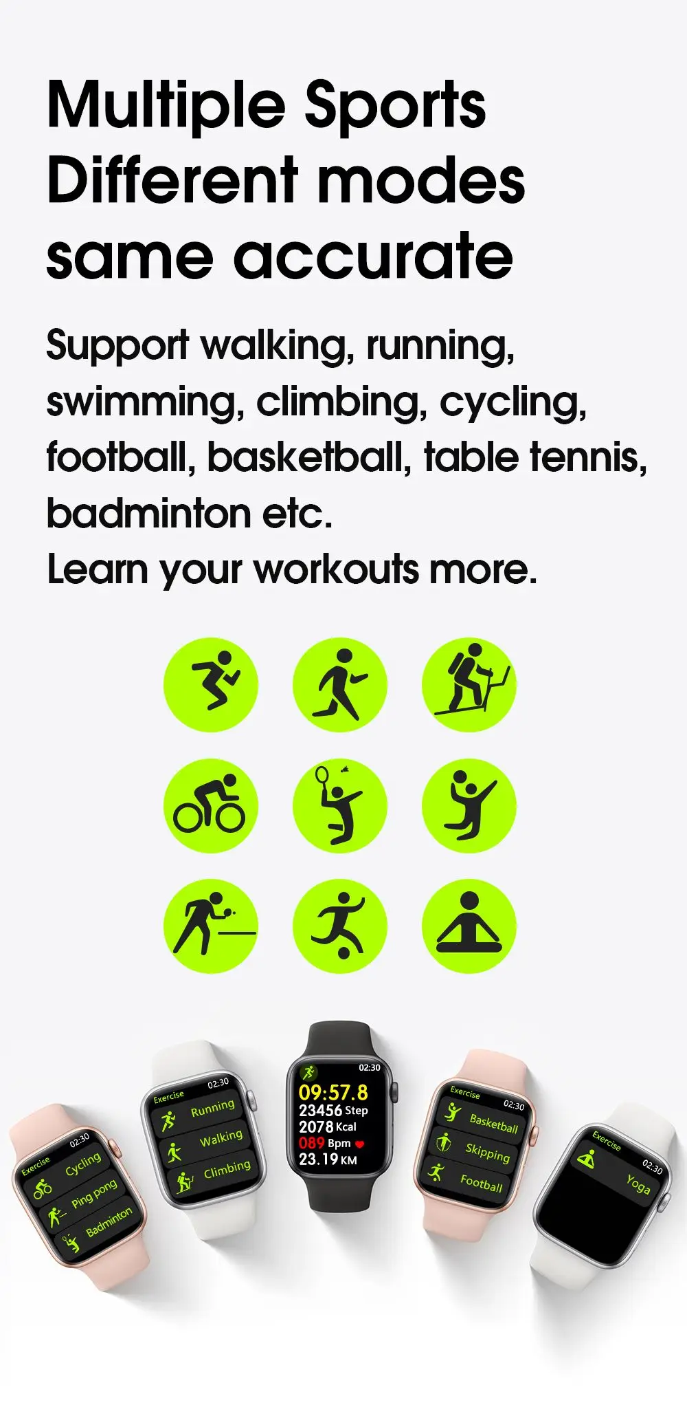1. Водонепроницаемость IP68:Подходит для мытья рук, дождя, плавания, удовлетворения ежедневных потребностей (Примечание: нельзя носить для ванны с горячей водой и сауны). 2. Несколько спортивных режимов:Поддержка ходьбы, бега, отжиманий, сидений, велоспорта, плавания, бесплатного обучения и т. д.