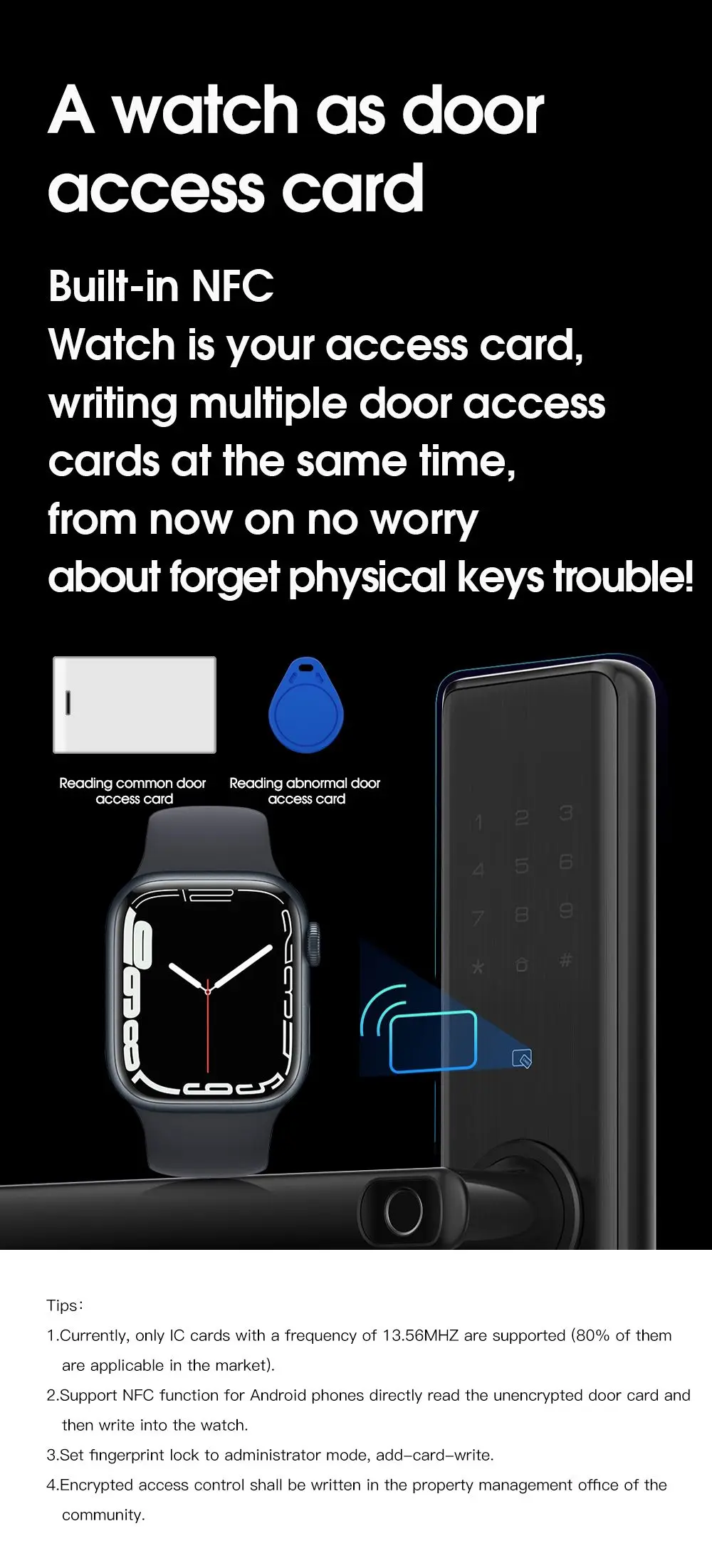3.Функция контроля доступа NFC:Встроенный в новейшую функцию NFC карты контроля доступа, часы-это карта контроля доступа, удобная и быстрая, поднимите запястье, чтобы быстро пройти.