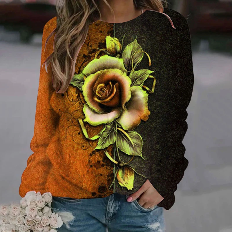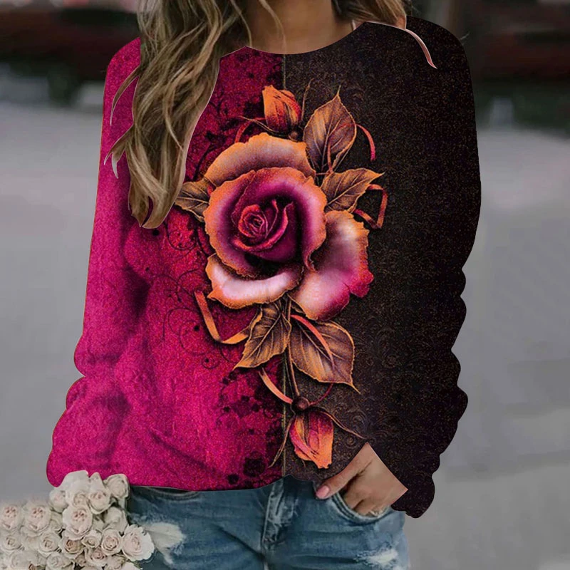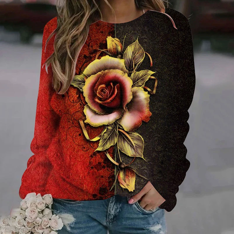 Женская толстовка с принтом розы, свободная универсальная модная блузка с длинными рукавами Harajuku, пуловер, одежда для женщин