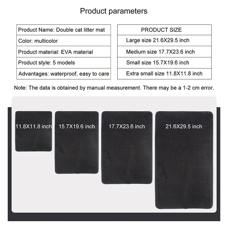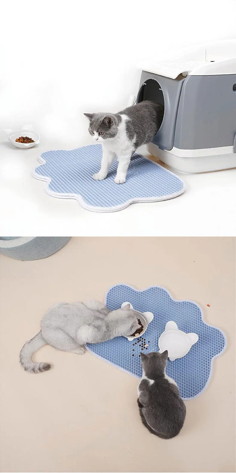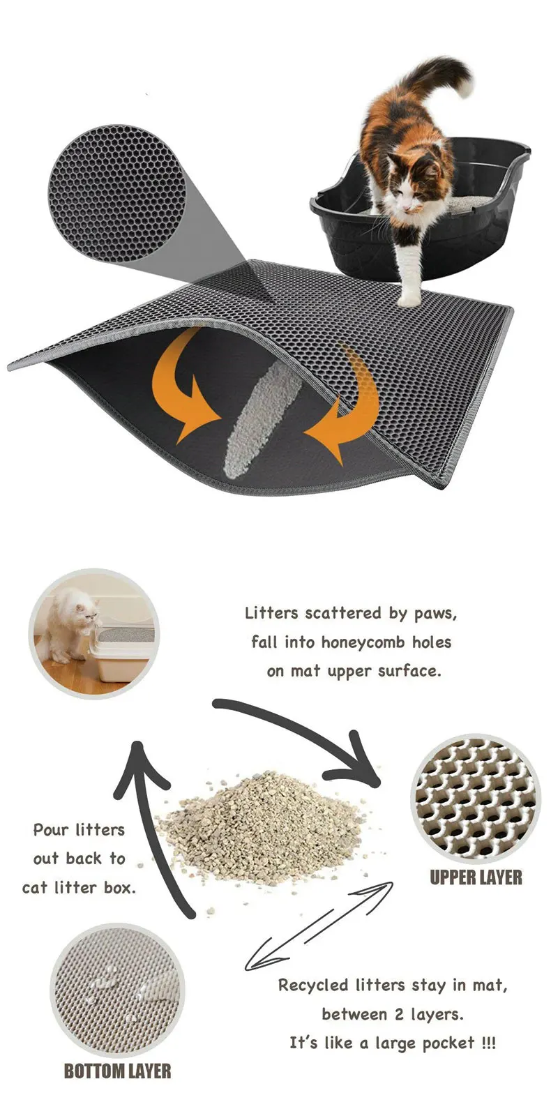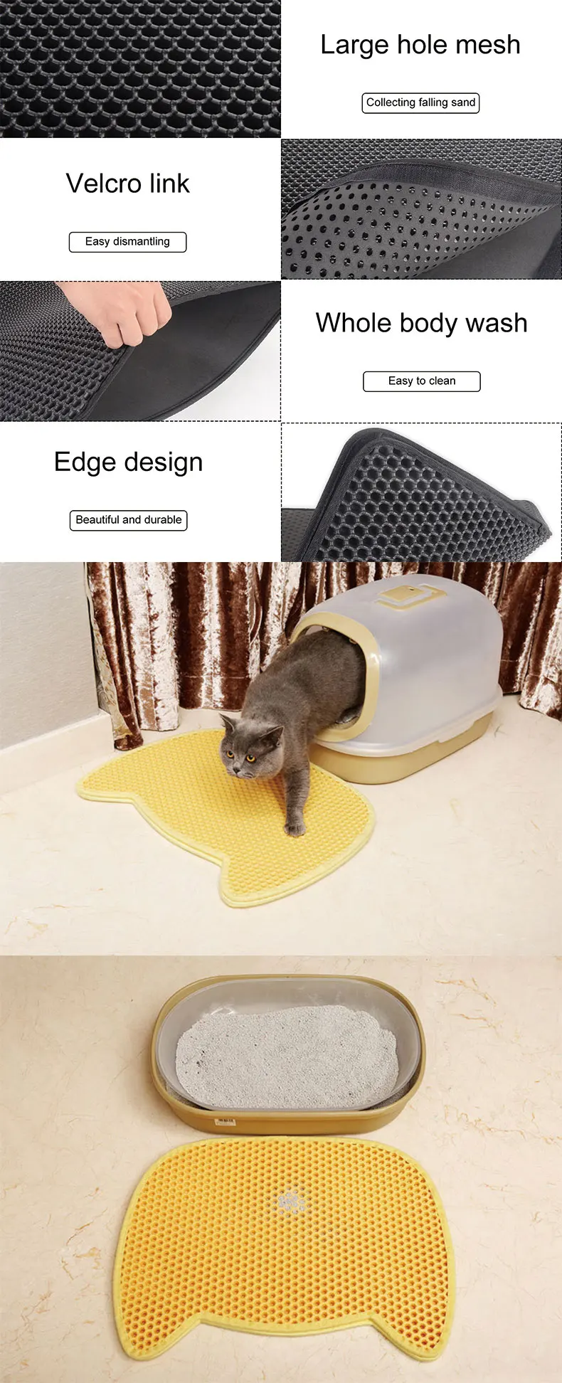 Изысканная стеганая кромка, толстая подошва, компактное качество изготовления, долговечное качество.Водонепроницаемый базовый слой предотвращает протекание воды и мочи на пол.Используется для экологически чистых и высокоэластичных пенопласта EVA, соты для легкого сбора песков.Двухслойный Траппер для кошачьих туалетов для улавливания мусора из кошачьих лап и ящика для мусора поможет вам сэкономить время очистки и стоимость песков.Легко чистить, просто вылейте мусор через открывающийся карман.
