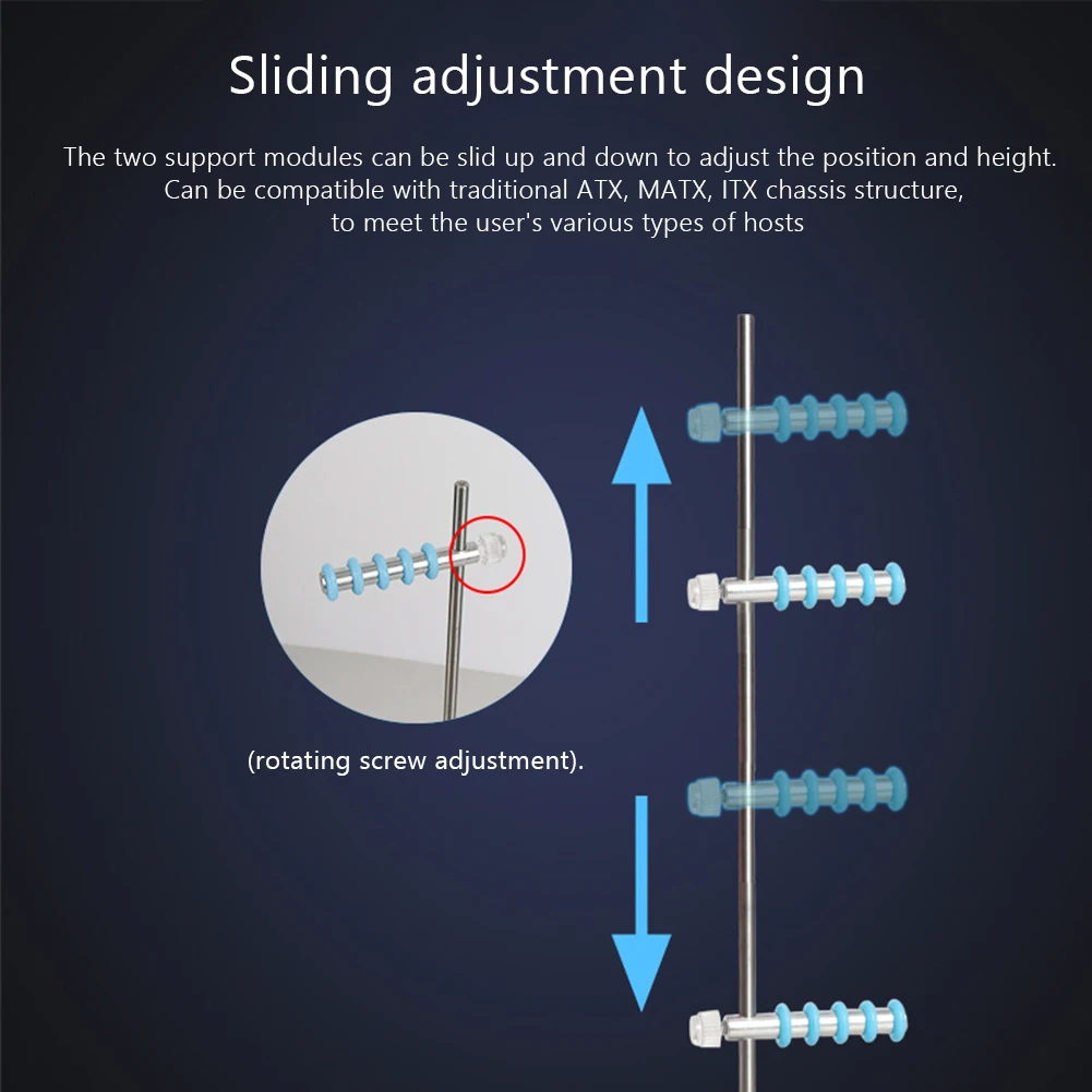 Конструкция регулировки скольжения (регулировка вращающегося винта). Два поддерживающих модуля могут скользить вверх и вниз для регулировки положения и высоты. Они могут быть совместимы с традиционной структурой шасси ATX, MATX и ITX для удовлетворения различных хост-компьютеров пользователей