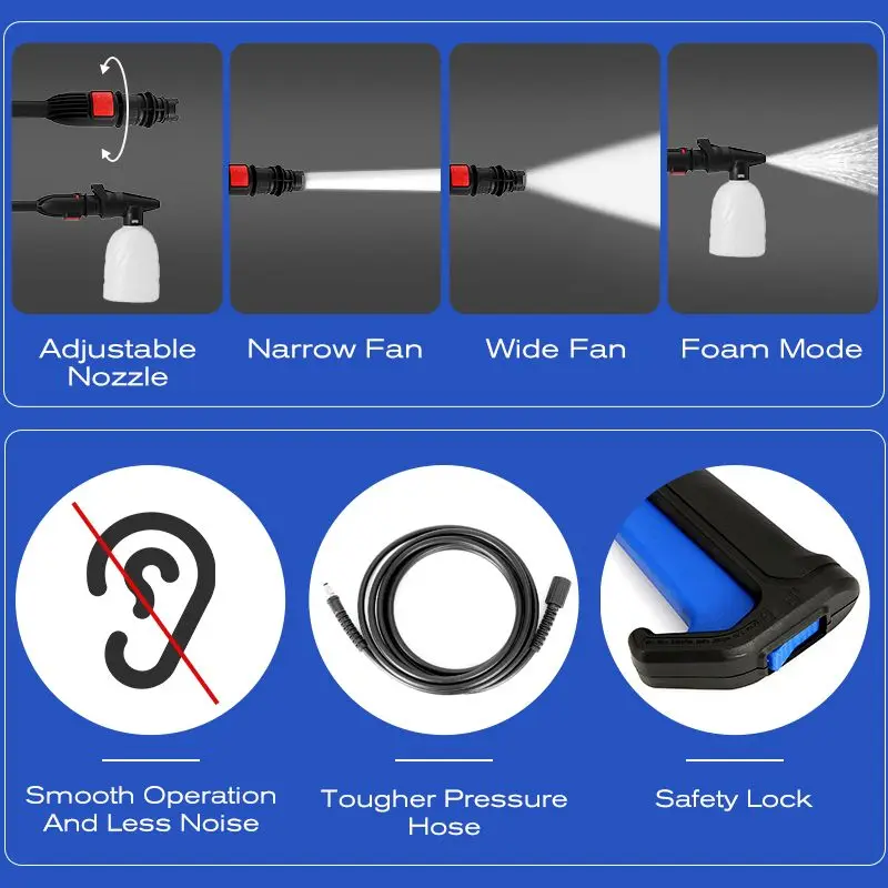 3. Более прочная и Максимальная безопасность: Наша электрическая стиральная машина автоматически отключает насос, когда триггер не задействован для экономии энергии и продления срока службы насоса. Пистолет-распылитель оснащен защитным замком, который безопаснее и надежнее.
