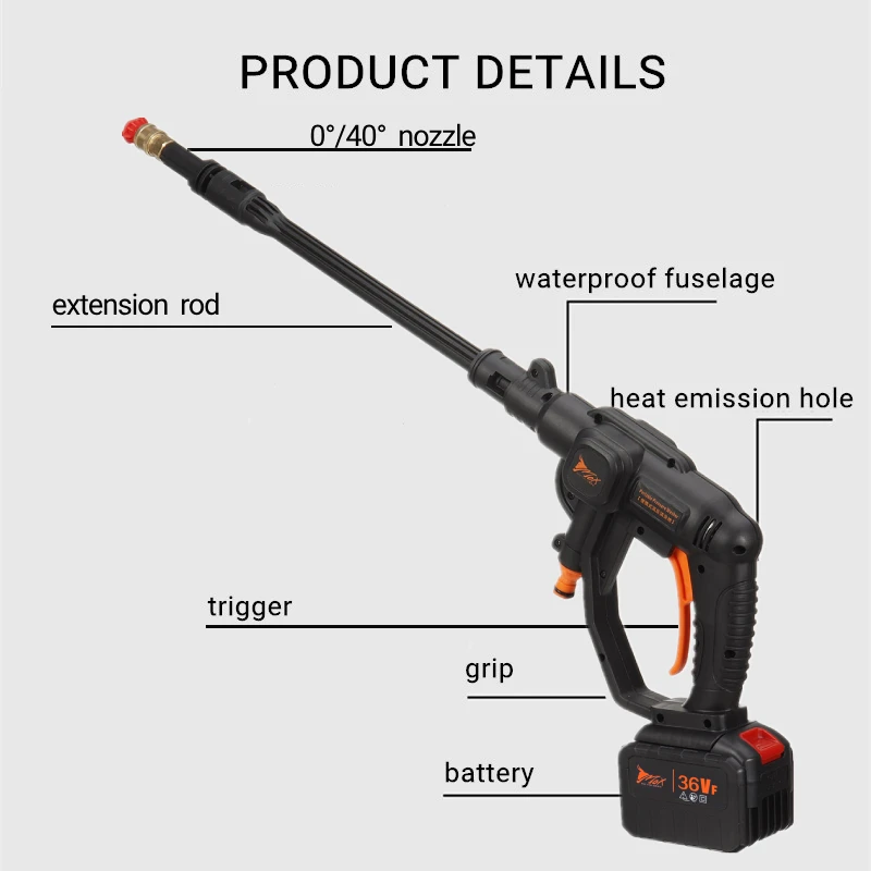 Характеристики:Материал: АБС + медьАккумуляторы Модель: 36VF/48VF (18V * 2 группы Батарея клетки) Напряжение батареи: 21 вЕмкость аккумулятора: 15000 мАч-22500 мАч Максимальный ток: 2.4AМощность: 260-300 ВтДавление Продукта: 0,9-3.5mp(130psi ~ 507psi) Подача воды: 1,5-3.2L/минМаксимальный расход: 4,5 л/мин Скорость двигателя: 2000 об/минНапряжение зарядного устройства: 100-240 В переменного токаЧастота: 50/60 Гц Зарядное устройство: штепсельная вилка европейского стандартаДлина водопровода: 5 метровДиапазон: 4-5 метровПодходит для: для полива сада, орошения в сельском хозяйстве, мытья автомобилей, уборки дома и т. д. Посылка включает в себя:1X стиральная машина1 батарея или 2 батареи (опционально)1 длинный Полюс1X зарядное устройство1 х 5 м Водопровод1X пенопластовый горшок1X фильтр1x сопло 0 °1x сопло 40 °