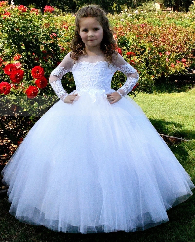 Классическое белое платье для девочки с цветочным принтом и кружевной аппликацией с бантом, бальное платье с длинным рукавом для свадьбы, дня рождения, платья для первого причастия