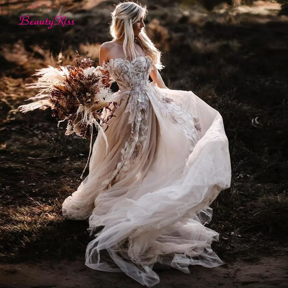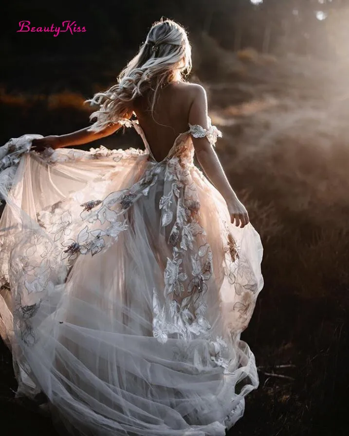 Цветочная аппликация, романтичная 2022 искусственная кружевная трапециевидная юбка с открытыми плечами и открытой спиной, привлекательная фатиновая ткань
