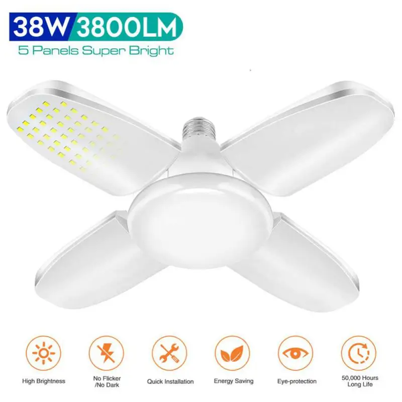 Складной светодиодный светильник для гаража E27, 38 Вт, , 4 угла наклона лезвия, регулируемый светильник s, лампа холодноготеплого белого света 3000-6500K