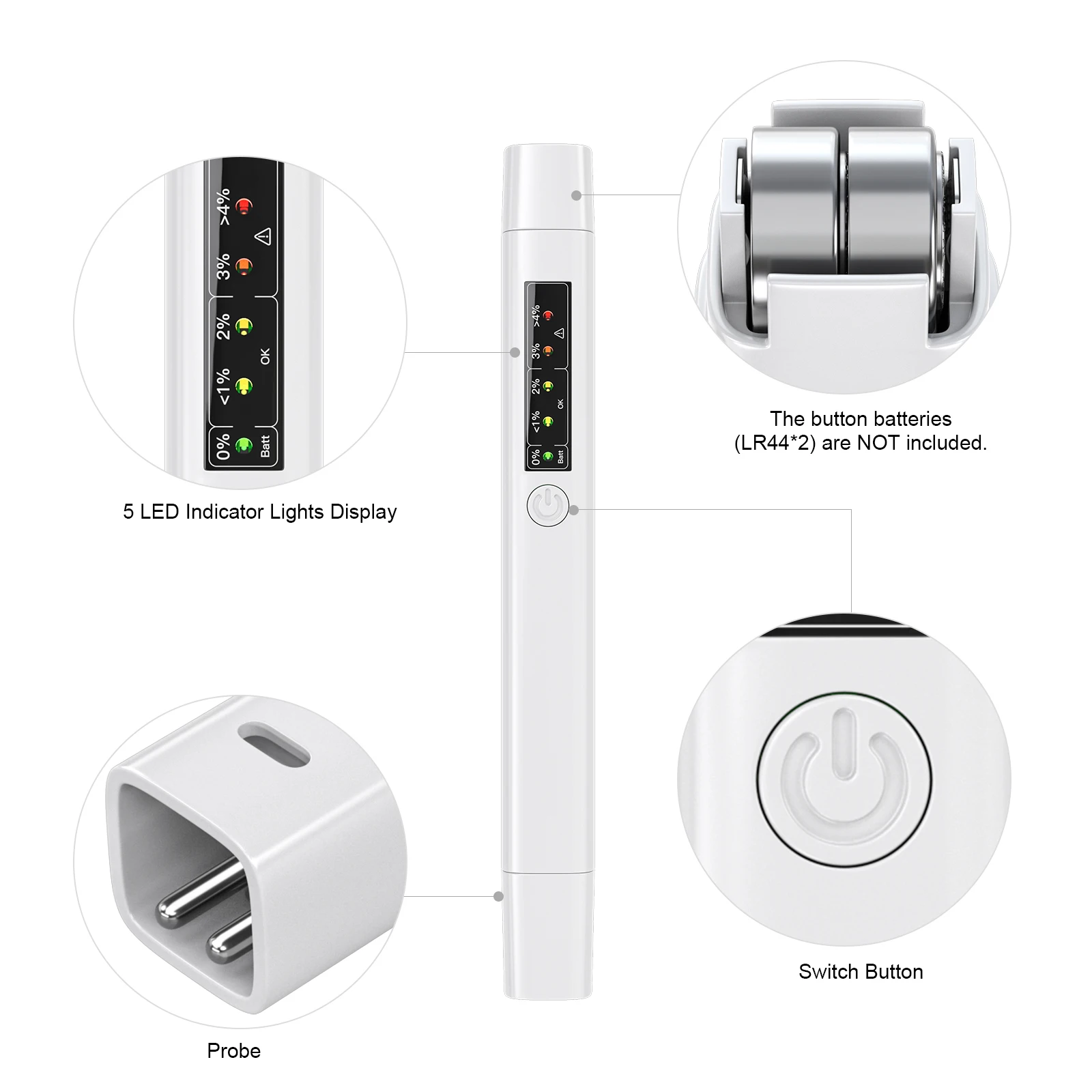 Спецификация1, проверьте качество тормозного масла автомобиля2, 5 светодиодных ламп отображают процент содержания влаги в тормозной жидкости3, автоматическое отключение4, 2 батареи LR44 (не входят в комплект)