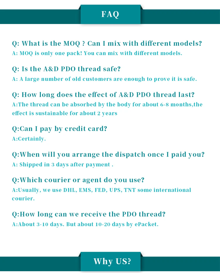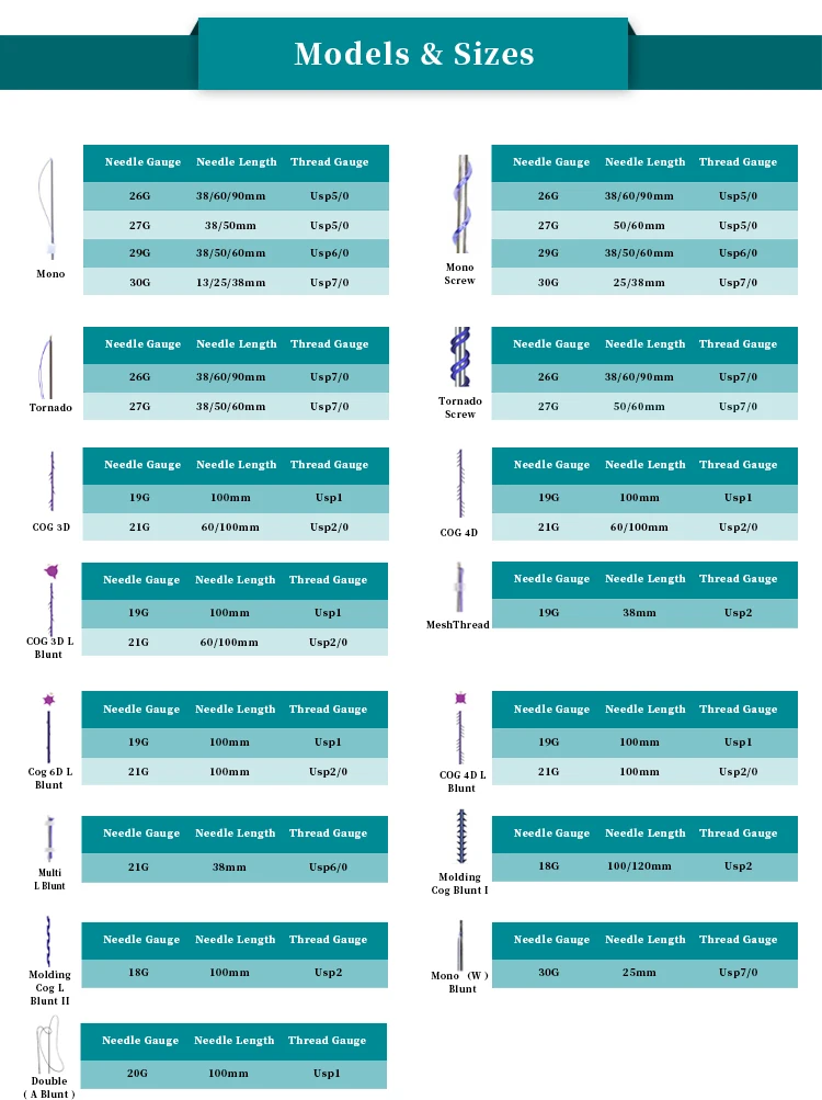 Резьба PdoЯвляются иглами подкрепленными синтетическим ПДО рассасывающимся швом. PDO (полидиоксанон) швы-это хирургические швы, которые используются для проведения сердечной хирургии. Все швы сертифицированы CE и pdo являются одним из самых безопасных материалов, которые могут быть использованы в организме. Ваша кожа полностью впитывает нить A & D в течение 4-6 месяцев, не оставляя рубцов.Эта обработка отличается высокой безопасностью, регулируемостью, кратковременной реакцией.Придайте рассасывающийся шов под кожу, чтобы поднять его,Как только нить впитывается, коллаген начинает расти, и она прослужит больше 2 лет.Стимулирует регенерацию коллагена и способствует циркуляции крови, чтобы поднимать и подтягивать кожу, и достичь двойного эффекта естественного удаления морщин лица.