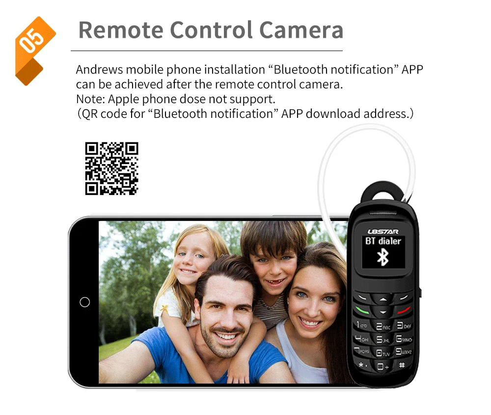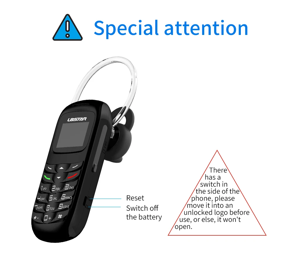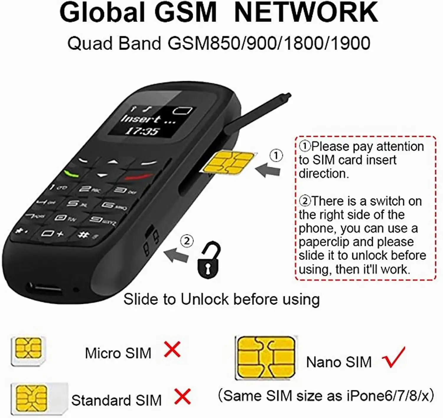 Его можно повесить, чтобы использовать в качестве bluetooth-гарнитурыЕго можно использовать как мобильный телефон при вставке sim-картыЭто делает синхронизацию сообщений по BluetoothСовместимость с мобильными телефонами и подушечками со встроенной функцией BluetoothИспользуется в качестве bluetooth-телефона для совершения звонков, прослушивания музыкиЛегко носить с собой и работать, свободные руки, мобильный телефон и планшетный ПКРазмер экрана: 0,66 дюймаBluetooth: BT2.0Sim-карта: одна стандартная sim-картаСеть: GSM 850/900/1800/1900 МГцТип: бар телефонТип сети: GSMЧастота: GSM 850/900/1800/1900 МГцBluetooth: ДаТип камеры: без камерыСлот для sim-карты: одна sim-картаРазъем Micro USB: ДаЯзыки: английский, французский, арабский, испанский, итальянский, русский, португальский, немецкий, вьетнамский, польский, голландскийДополнительные характеристики: MP3,PeopleСотовый телефон: 1Аккумулятор: аккумулятор 300 мАч-1 шт.USB кабель: 1Руководство на английском языке: 1Размер продукта: 7,50x2,40x1,20 см/2,95x0,94x0,47 дюйм (ов)Посылка Размеры: 17,50x9,00x4,50 см/6,89x3,54x1,77 дюйм (ов)Посылка Вес: 0,183 кгПримечания:1. Перед использованием вставьте замок (под слотом для sim-карты) с помощью автомобильного штифта! В противном случае это не может быть включено.2. Полностью зарядите телефон перед первым использованием.3. Разблокированный GSM работает с T-Mobile или Metro PCS, не будет работать с AT&T, Sprint & Verizon или Boost