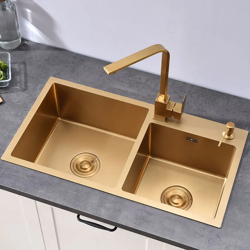 Золотая матовая кухонная раковина, двойная чаша, нержавеющая сталь,...