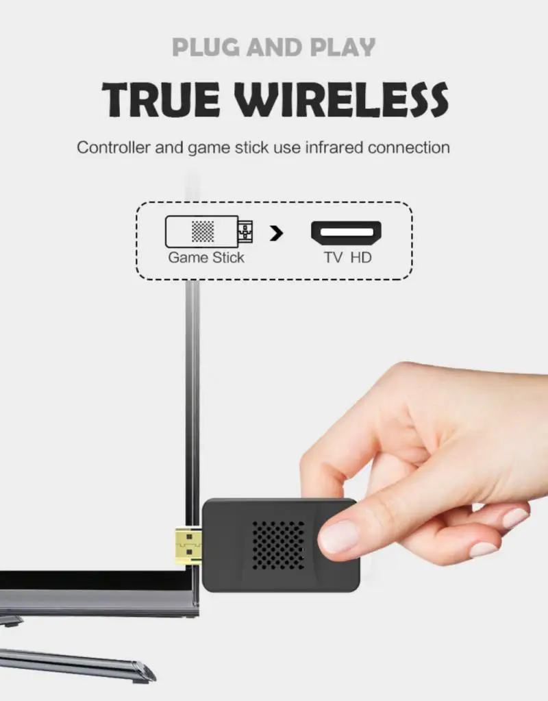 1. HDMI-совместимый выход видео ТВ игровой Стик, эта Ретро игровая консоль соединена HD кабелем, вы можете использовать его на TV s, компьютеры, проекторы и другие устройства с HD интерфейсом, не нужно подключаться к Интернету, подключаться и играть, прост в использовании. 4K HD дисплей, Наслаждайтесь игрой с семьей и друзьями.