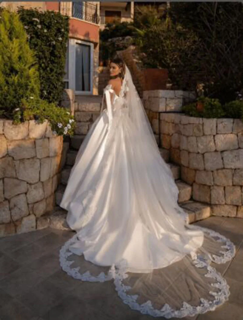 Платье свадебное с длинным шлейфом, атласное, с длинным рукавом