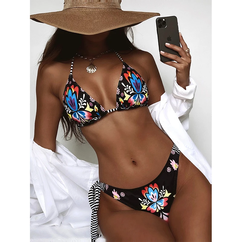 Купальник-бикини женский треугольный с высоким вырезом и принтом