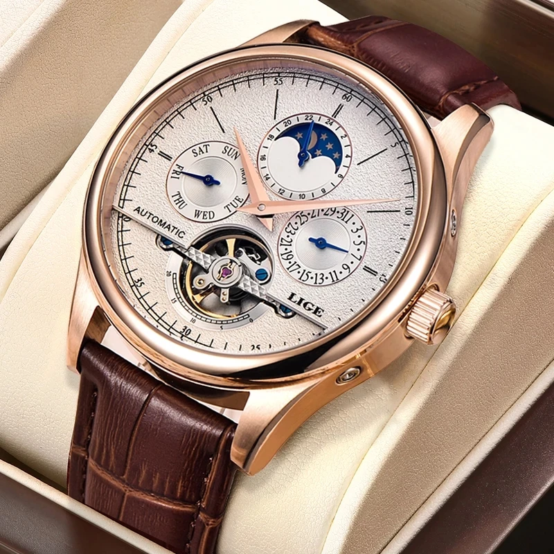 Часы наручные LIGE Мужские механические, брендовые Роскошные модные водонепроницаемые с кожаным ремешком, с турбийоном, 50 м