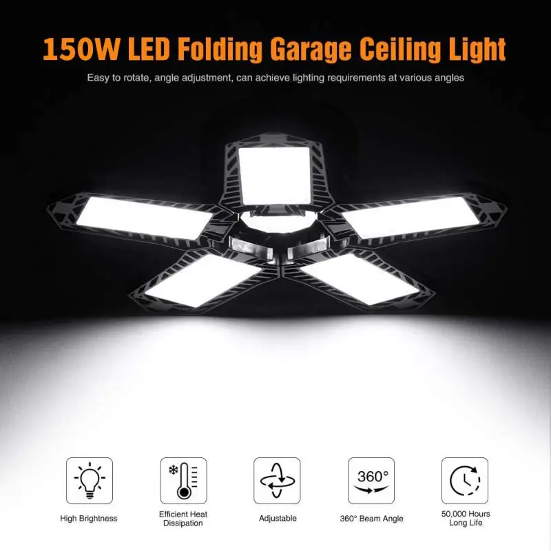 Регулируемый светодиодный потолочный светильник. Уникальный деформирующий широкоугольный Ультра-яркий гаражный светильник, 5 светильник-панели можно отрегулировать на 90 градусов, светильник-угол наклона можно регулировать с 360 ° стабильный светильник со всеми направлениями.