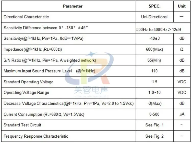 Название продукта: микрофон FR1465Параметры Размер: FR1465 диаметр 14 мм Высота 6,5 ммМетод сварки: соединение проволокиНаправленность: одна точкаМетод Electret: задний ПолюсРабочее напряжение: 1,0-10VРабочий ток: MAX0.5mAЧастотный диапазон отклика: 50 Гц-20000 ГцОтношение сигнал-шум: более 66дбПосылка2 штуки