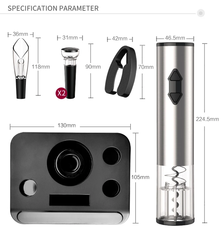 1x Электрический Нож для вина1 х Фольга резак1 х Руководство пользователя на китайском и английском языках1x Usb кабель1 шт. винная насадка1 винная стопка1x база для храненияПримечания:1. Возможны незначительные отклонения при измерении.2. Благодаря светильник экране монитора фактический цвет товара может быть s светильник ly отличается от изображениях, соответствует реальному стилю, спасибо за понимание.