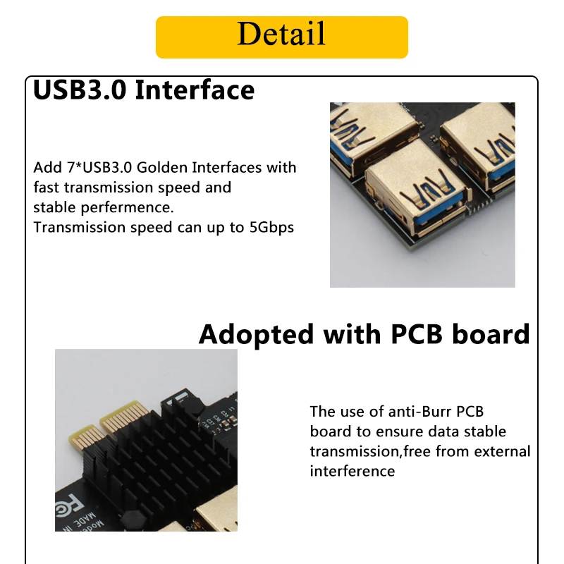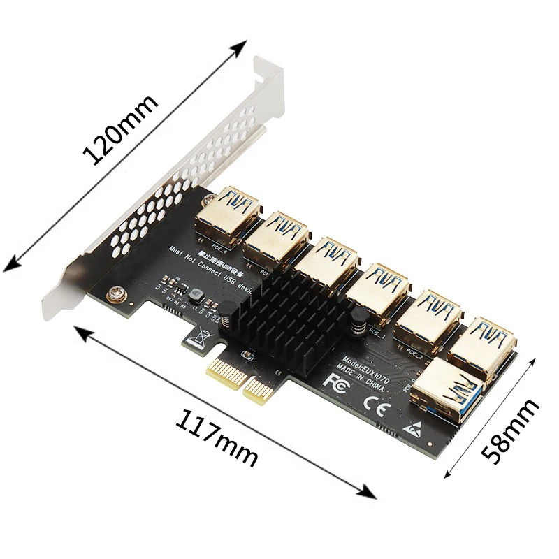 1. 7 слотов обеспечивают большую расширяемость2. Подключается непосредственно к плате без какого-либо удлинителя кабеля, может быть закреплен на чехол3. Разъем PCI-E, дополнительный кабель питания не требуется4. Только один кабель к слоту, легко и удобно оседать и устанавливать5. С IC тепловым радиатором