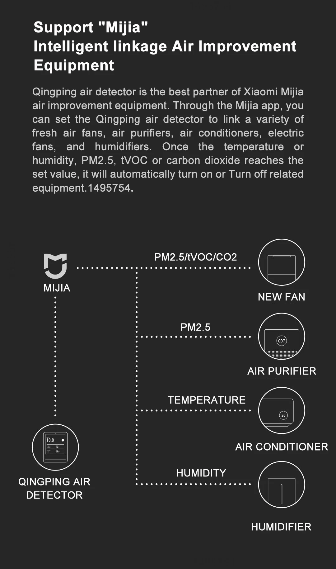 Qingping детектор воздуха является лучшим партнеромОборудования для улучшения воздуха Xiaomi Mijia. Через приложение Mijia вы можете установитьQingping детектор воздуха соединяет различные вентиляторы свежего воздуха, очистители воздуха,Кондиционеры, электрические вентиляторы и увлажнители. После температуры илиВлажность, PM2.5, tVOC или углекислый газ достигает установленного значения, это будетАвтоматическое включение или выключение соответствующего оборудования. 1495754,