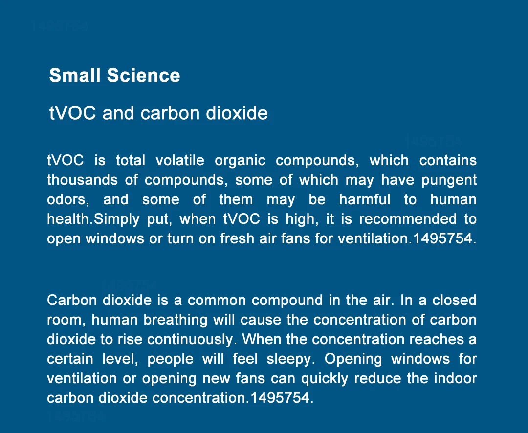 TVOCЭто полные летучие органические соединения, которые содержат тысячи соединений,Некоторые из которых могут иметь резкие запахи, а некоторые из них могут быть вредны для здоровья человека. Простое здоровье.Проще говоря, когда tVOC высокий, рекомендуется открывать окнаИли включите вентиляторы свежего воздуха для вентиляции. 1495754