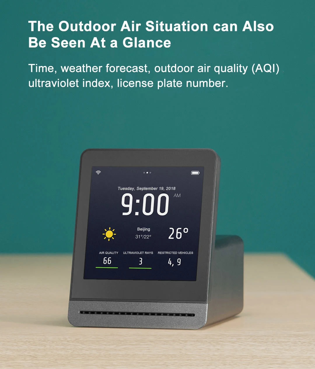 Время, прогноз погоды, качество наружного воздуха(AQI) ультрафиолетовый индекс, номер номерного знака.